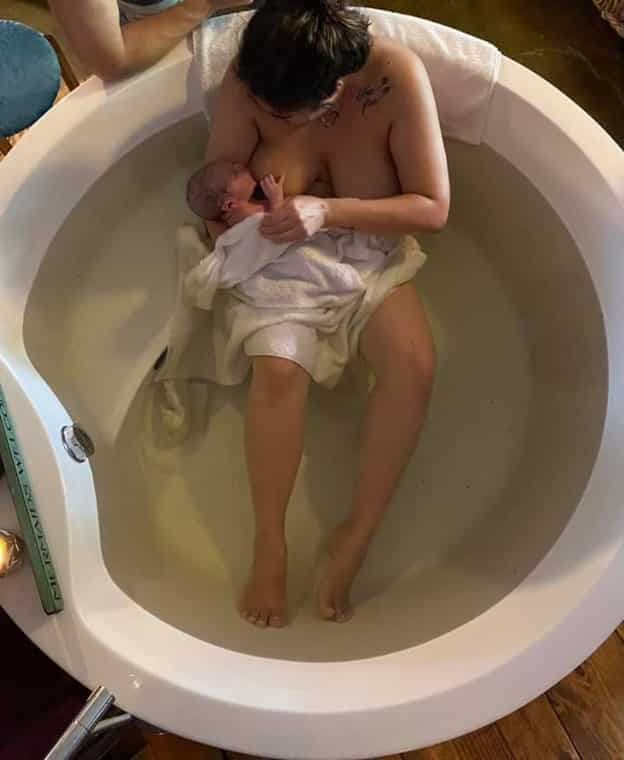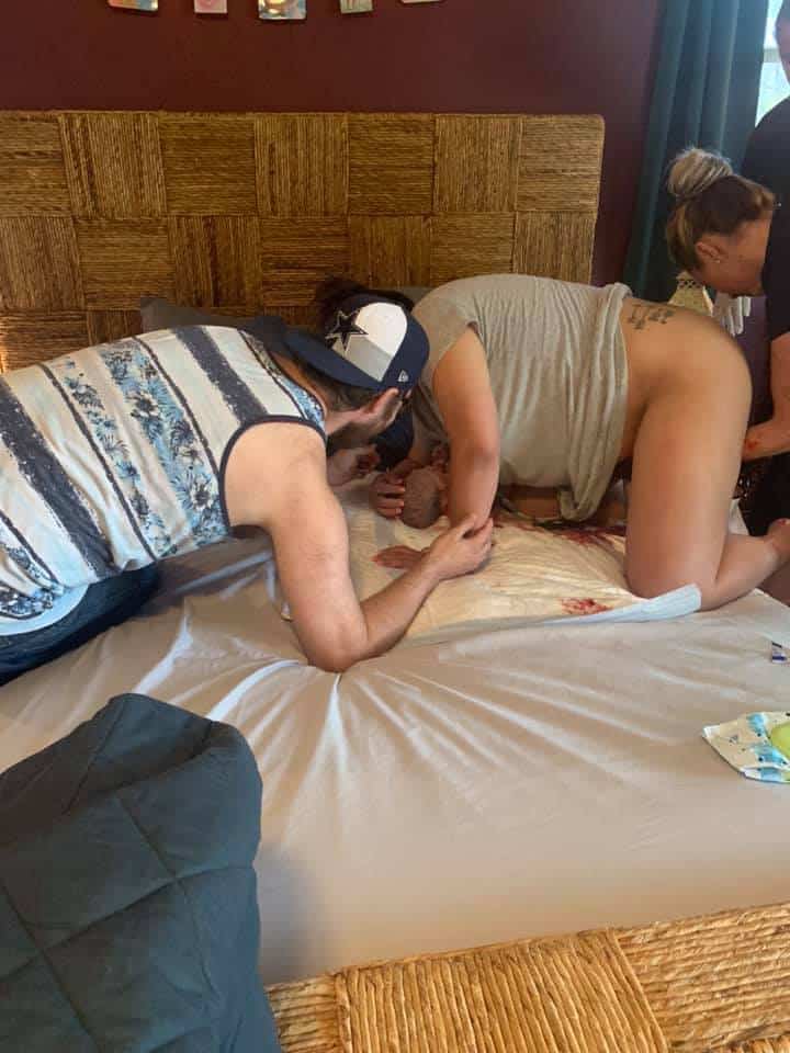 My sister called the midwife and said baby is moving down we need to meet now. I mentally switched to center (a hypnobirthing tool), and we all piled into the car and my husband set up the tracks to play for me on the drive (less than two miles thankfully). We beat the midwives and I had the strongest urge to push baby out and could feel him moving down with each wave! I used my Peace cue (Hypnobabies cue for instant physical comfort) over and over again to keep myself from pushing and keep my mind calm until they arrived. The midwives all arrived five minutes later, and we all rushed into the birthing center with no time to fill the tub! They prepped the bed in seconds and Luke was born four minutes after the midwives arrived, 9:17 am!