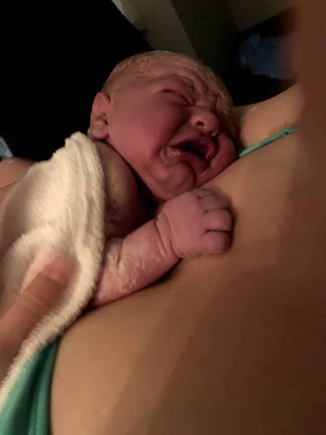 This time, I liked being able to interact with Tucker more and communicate what I needed and enjoy our time together. He responded saying that he doubted those breaks would continue much longer, but he was wrong! Not long after, I switched from a reclined position to leaning over the side of the tub. I couldn’t figure out what felt best and was starting to feel restless. Suddenly, I had to poop. I knew that this is usually a sign of being ready to push since the sensations are similar, but I could tell this was an actual bowel movement, so I got myself out of the tub and over to the toilet. As soon as I finished, though, my body gave a very strong push, and I panicked a little. I told my husband, “I’m feeling pushy! I need to get back in the tub!” He hurried over to me to help, but my body started pushing, and there was no going anywhere! I stood up (I did NOT want my baby born in a toilet!) and leaned against my husband and began moaning and even roaring a little. Tucker tried gently moving toward the tub, but I said, “No, don’t pull me!” He responded, “Ok, what should I do?” I blurted out “Catch him!” just in time. “What?! Catch him?!” Surprised it was happening so quickly, Tucker immediately ducked down and gently supported baby’s head and caught the rest of his body as it slid out at 4:49AM, just as the midwives came bustling in, having heard me from the lobby. Two of the women supported my weight so my husband could stand up (I was still leaning on him) while one got a chucks pad under me. I took our baby from my husband, and with the support of everyone, made it over to the bed. According to my husband, it was less than 2 minutes from me getting out of the tub to baby being in his arms.