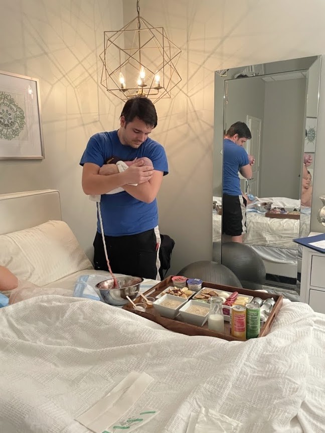 Everyone, myself included, expected there to be some pretty serious tearing from how fast he came, but there was nothing! I was so relieved, though admittedly a tad disappointed that my dream water birth evaded me once again! They checked our vitals and my bleeding, and everything looked good! With baby snuggled against my chest, I soon birthed the placenta, and we placed it in a bowl so my husband could hold him while we waited for the cord to turn white, and then Tucker cut it. While Tucker did skin-to-skin and Face Timed our kids, one of the midwives helped me shower and got me all snuggled into the bed, and then they left the 3 of us alone for almost 2 full hours to just nap and enjoy skin-to-skin.