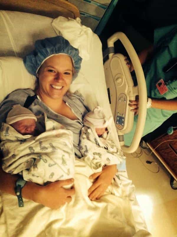I told Jordan and he proceeded to run back and forth between the bathroom where I was to the nurses’ desk outside yelling, “CAN I GET SOME HELP?” Finally, the nurses felt some urgency and walked me over to one of the delivery rooms. Somehow, I got changed into the gown and in the bed and the doctor who was on call checked my dilation and announced I was complete….no duh… I got really excited when he said that though because the only pelvic exam I had was the last one 🙂 and I was so so excited to meet my babies!