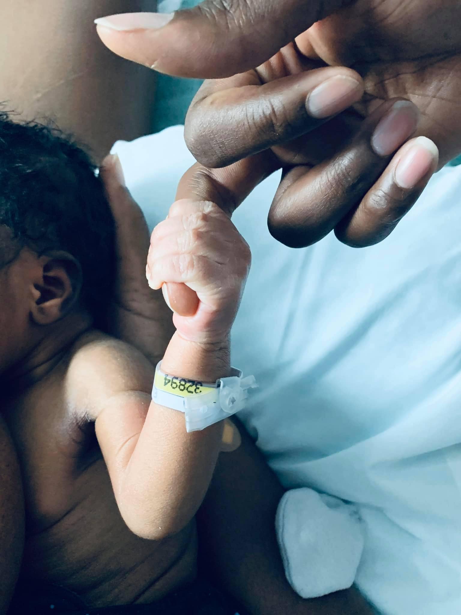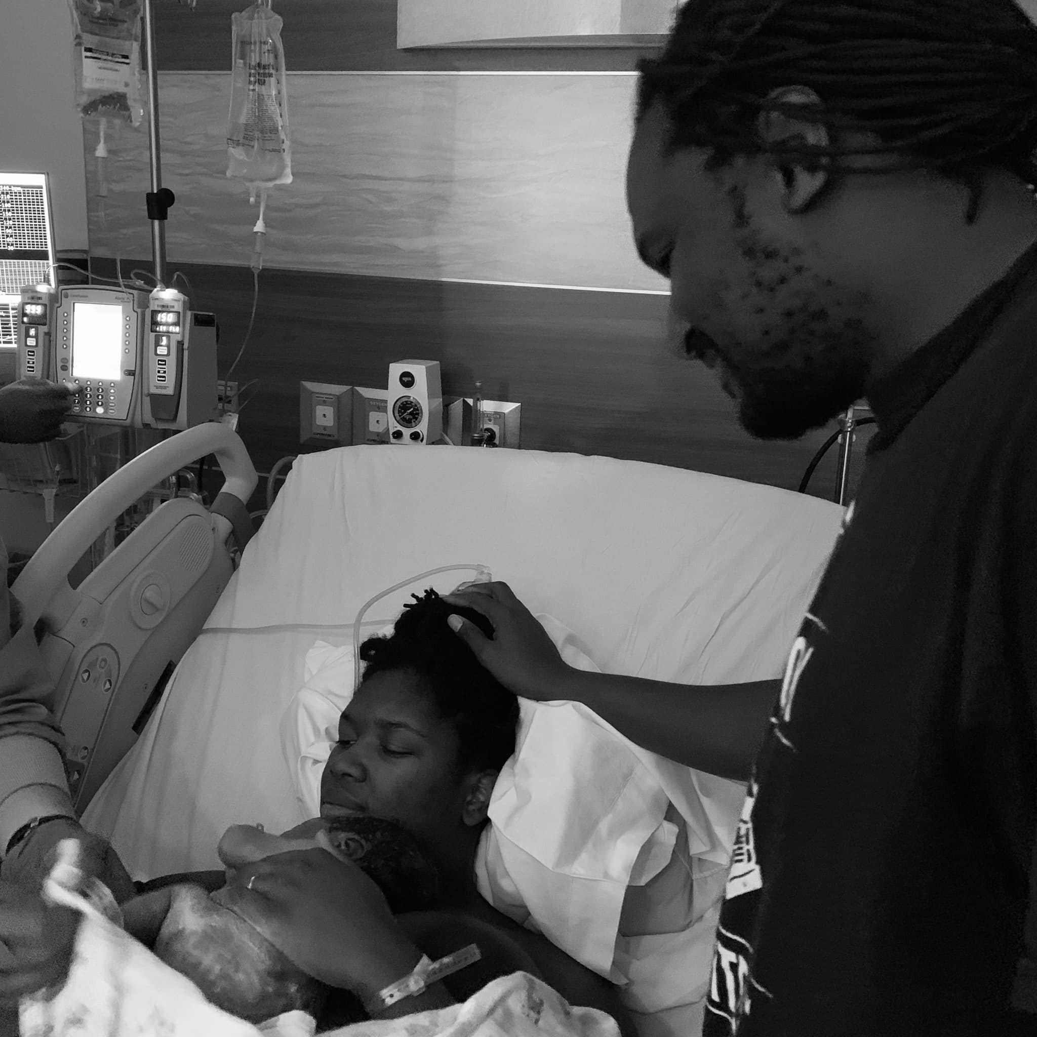 So, it’s around 3, my nurse got the birth chair ready for me to sit on because I didn’t want the bed. It’s a stool with a hole inside. After a few waves of sitting there I felt something shift. Like to the point where I couldn’t keep quiet during a wave and my legs would work right. I couldn’t sit anymore. Kept telling myself that “it’s only temporary. It’s only Temporary.” I told my husband he needed to make me a pallet on the floor. I wanted to be on the floor extremely bad. He and the nurse made me a space close to the monitors. Within a few minutes, I was hyperventilating which caused the baby’s heart rate to drop so she told me I had to get up off of the floor and into the bed because I needed oxygen. “I can’t.” She said, “yes you can.” But I really couldn’t. I had begun to feel pressure, but I think I was questioning it because it didn’t feel like the description of having to poop. It felt like the need to push and I wasn’t telling her because I didn’t know exactly what it was. I kept losing the sensation. Then all of a sudden her and my husband picked me up (all 220 lbs) and put me in bed. She gave me the oxygen while I was starting to push.