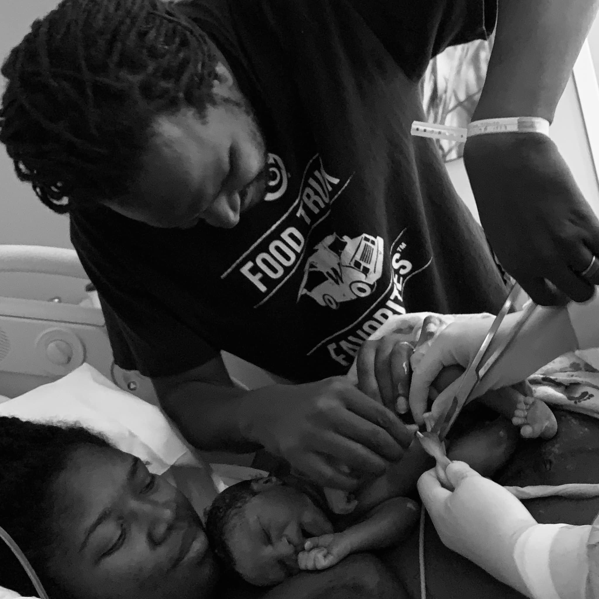 They put him on my chest, and we didn’t know who we were meeting at first and then my husband opened his legs and said “It’s a dingaling!” We got a Baby boy! The cord turned white pretty quickly and he was able to cut the cord.