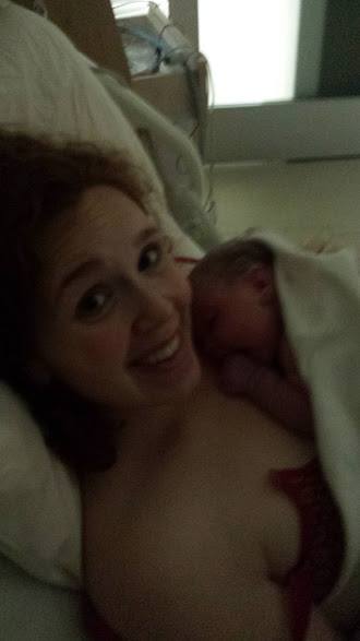 I started on my right side, but then soon I turned and hopped up to face the back of the bed. As I was pushing I heard the doctor telling my husband that the pediatrician might need to see the baby first after she was born because there had been meconium when my water ruptured. Soon I began to feel the powerful stretching as baby girl was crowning, another new sensation. I wanted that part to be done with as soon as possible so I could finally hold my baby! A few pushes later her head was out, forehead first, and then one more push for her shoulders/body and I felt another gush of fluid follow her out, along with a hearty cry.