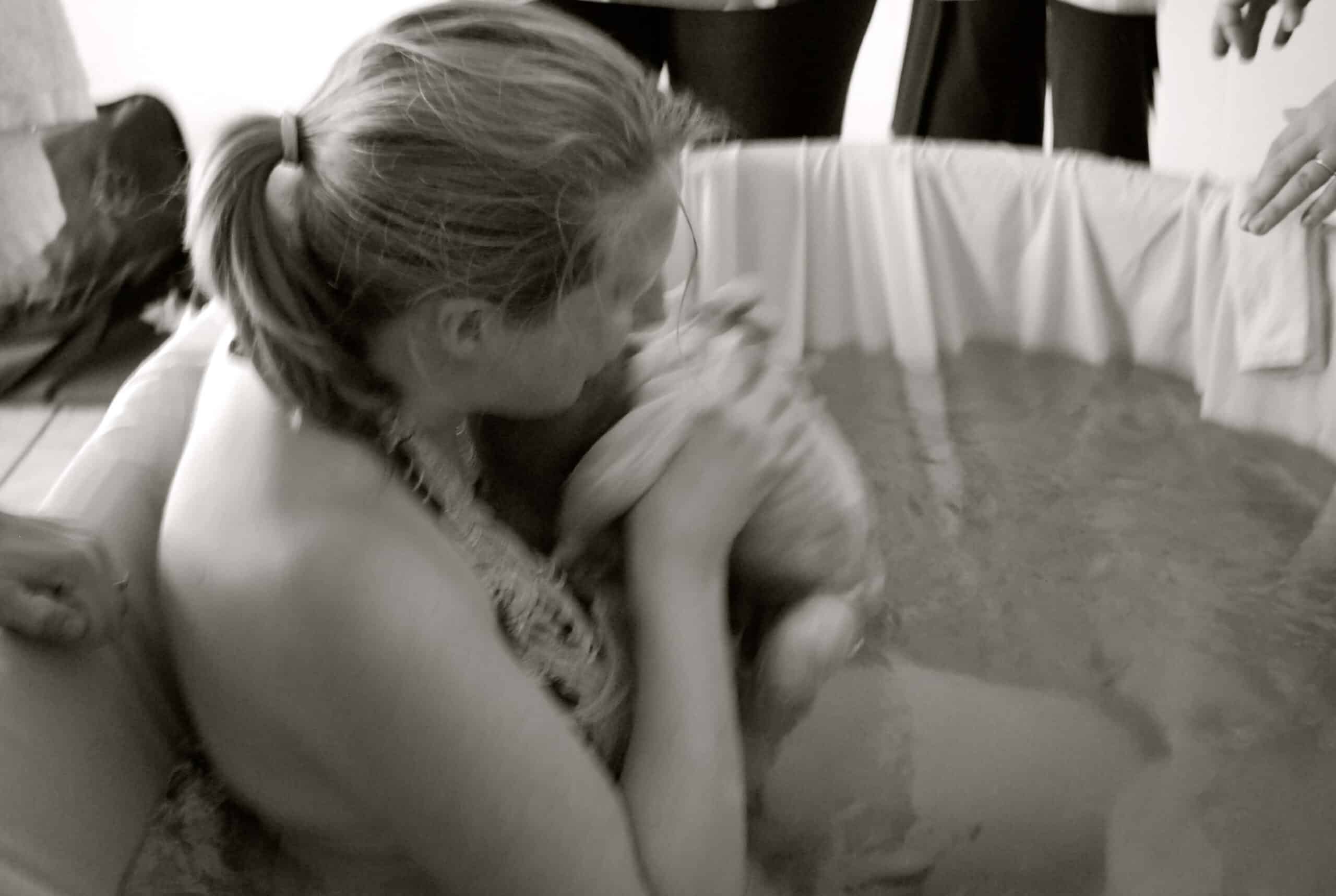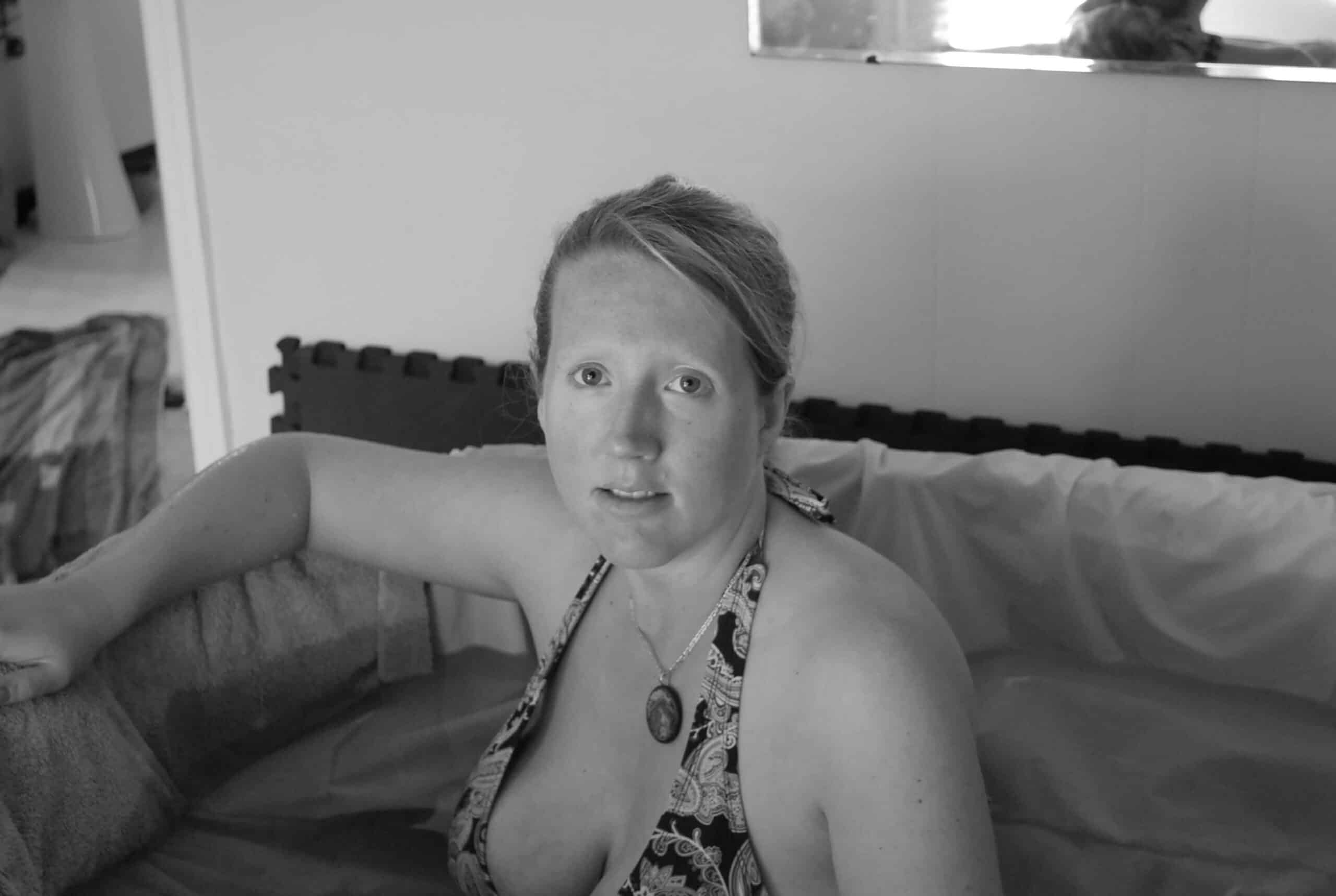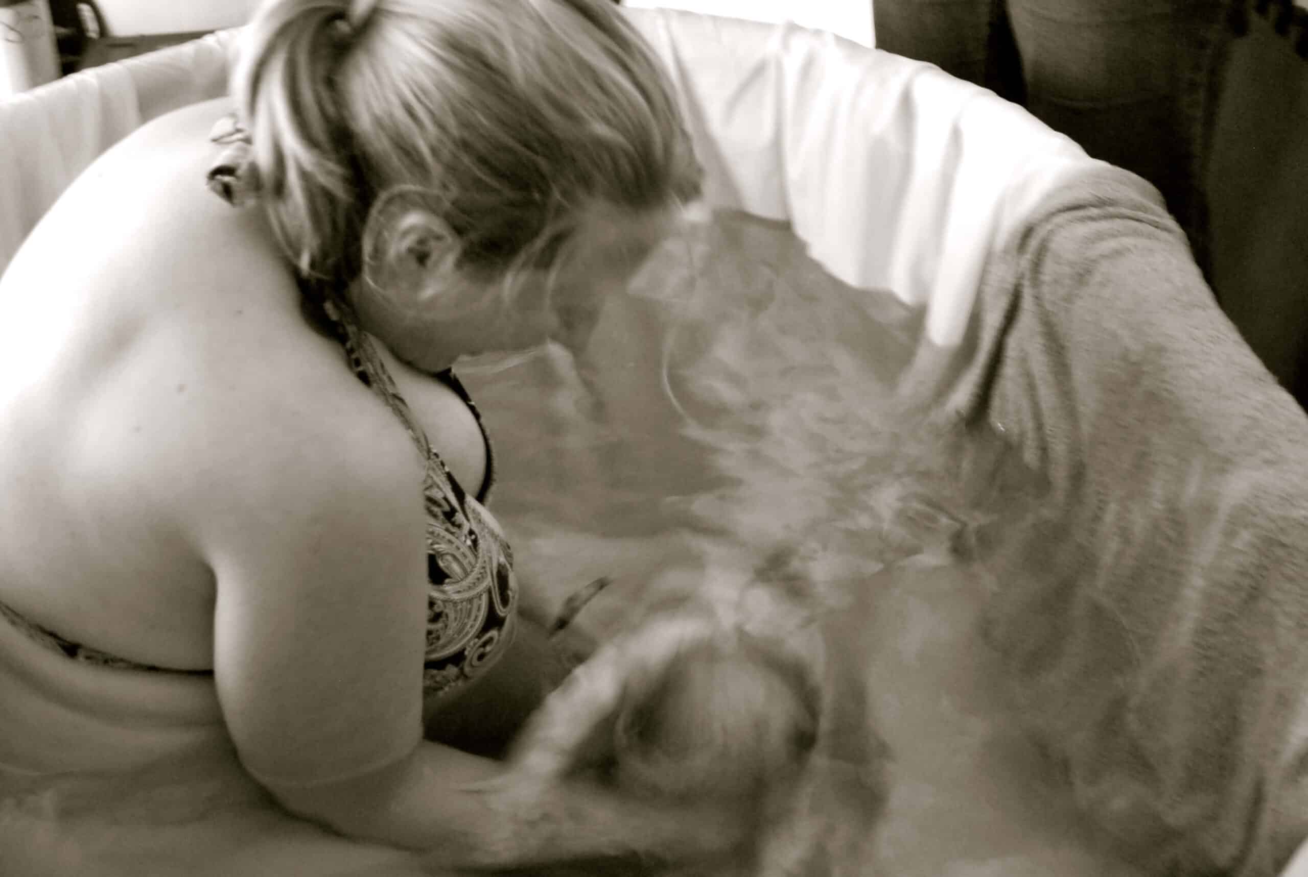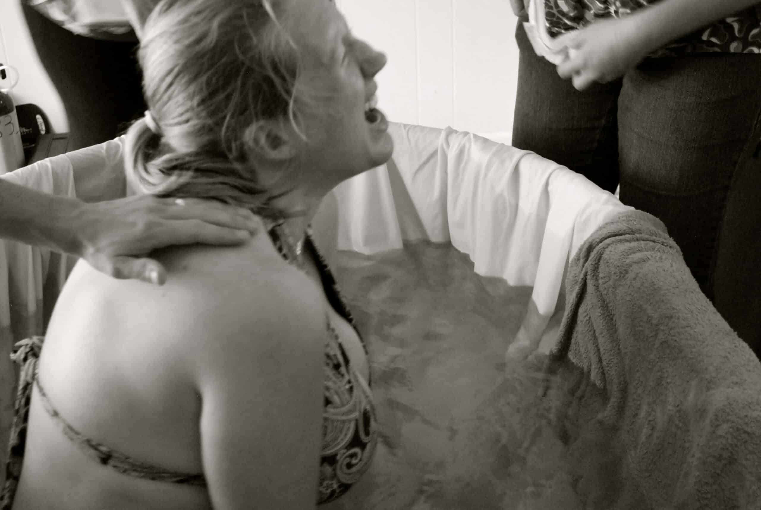 During the waves, I really wasn’t sure if I could stand to have anyone’s hands on my back and said so. I was so confused on what I needed, the sensations were overwhelming my body. My hands were firmly placed against my perineum. Some people wonder how it is possible to support your own perineum around a belly, but I had my legs far, far apart at this point, with my legs starting to go numb in the water. The water was supporting my weight, with my head on the side. I could feel the baby moving down. The sac was right there during the next wave, I pushed back on my perineum while I pushed with all my might, the sounds in my voice being the loudest roar. I felt some of the sac bubble out in front of the babies head, like a small water bubble getting pinched, the sensations were overwhelmingly strong, I tried to stand up to get away from them. In that moment a piercing scream came from my mouth as I was so confused on how to get the head out….and then, the head slipped out.