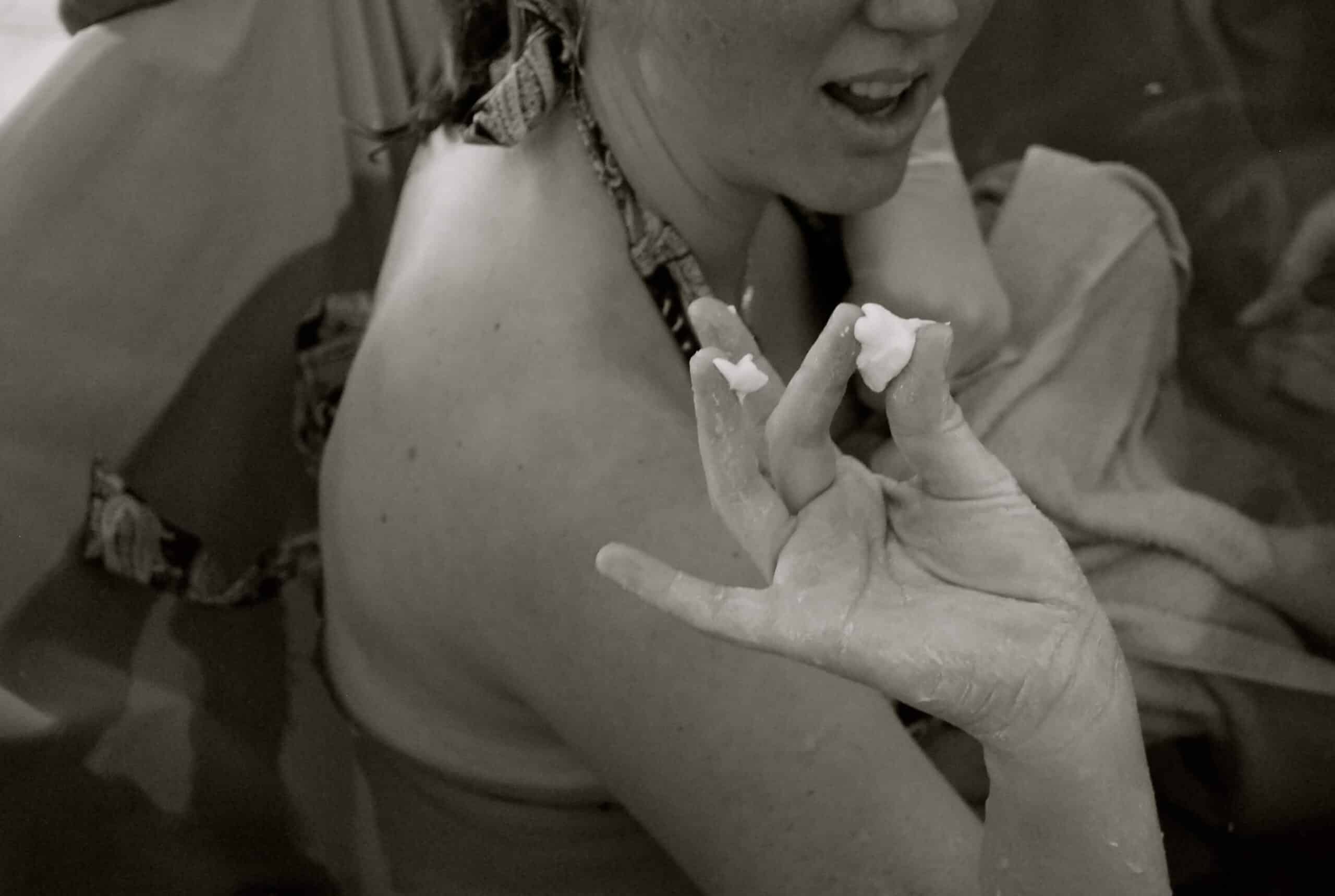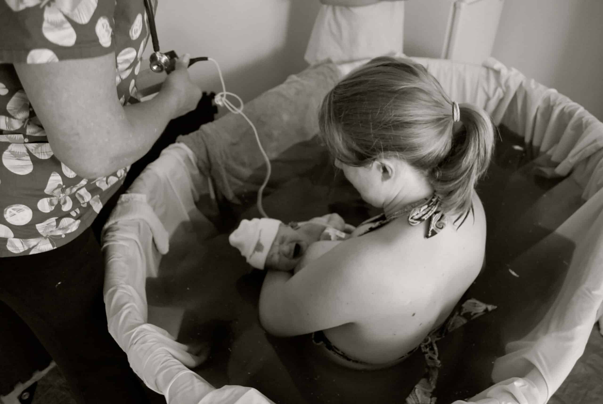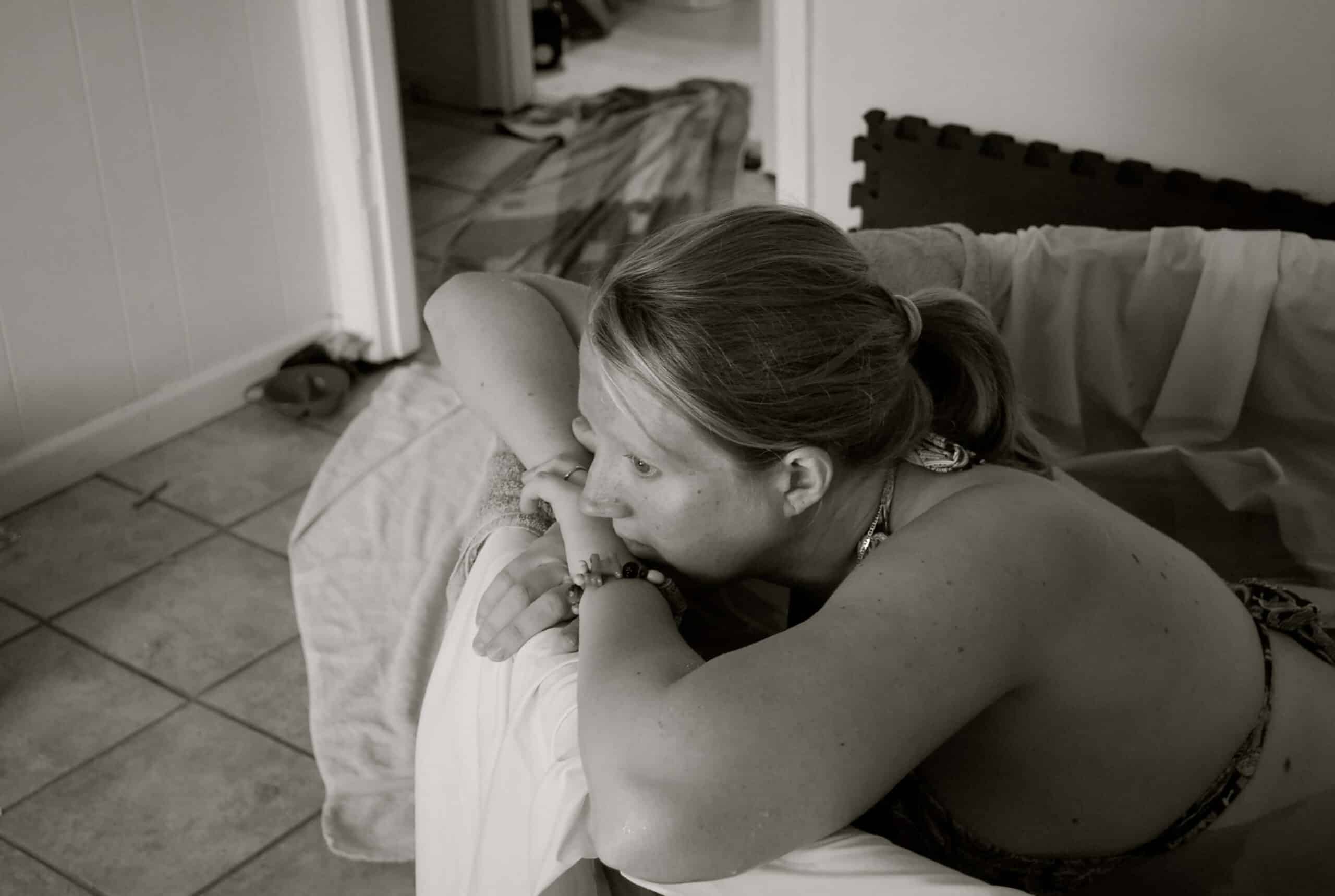I was still having space between the waves, where I would just lean my head into the edge of the tub. Then during the next wave, I placed my hands in a circle around my perineum as the pushing urge became so strong. I was going to do my own perineum support.