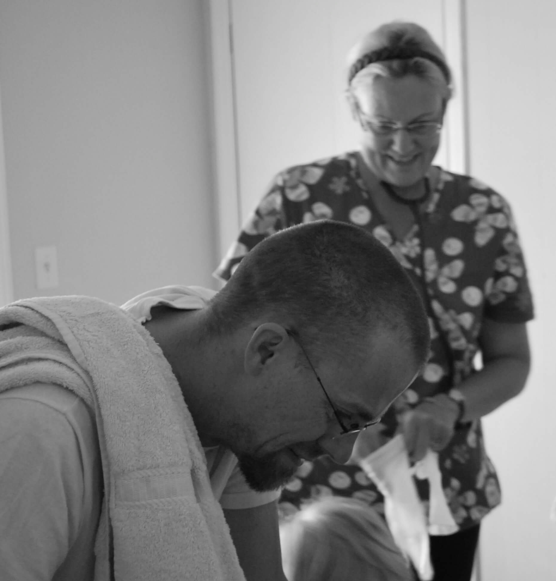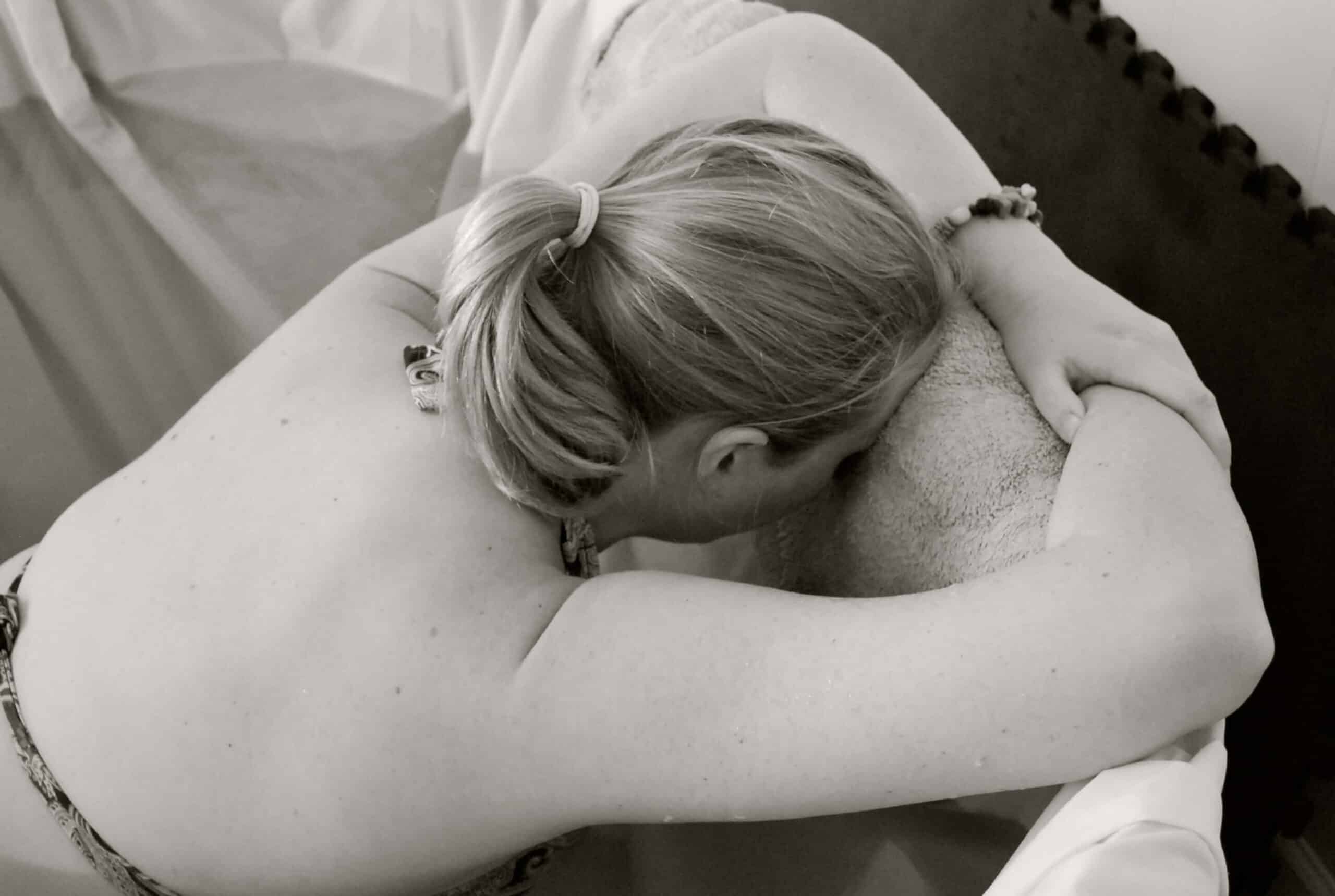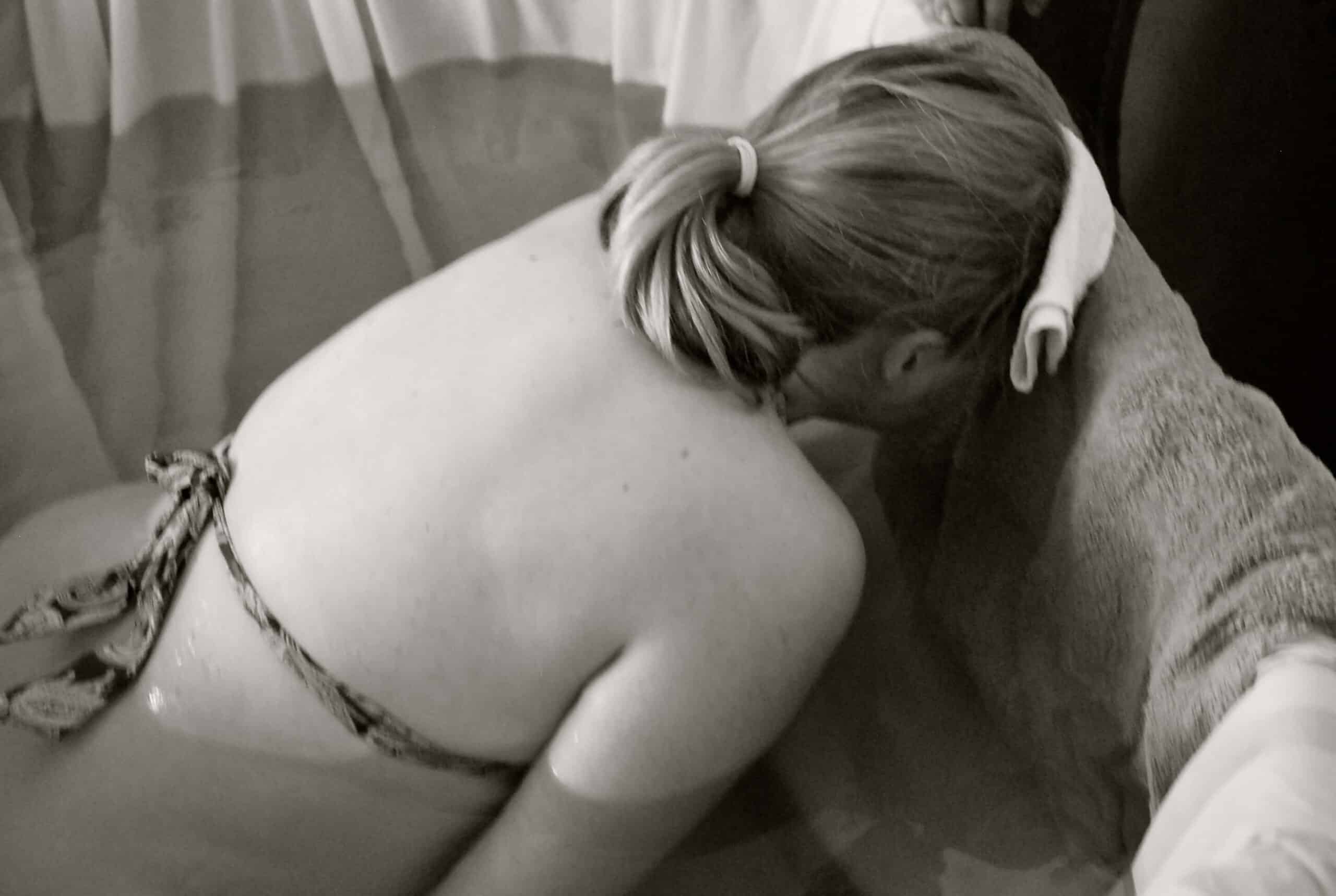I was getting louder and louder, the grunting roars where coming closer together. I would put my head into the towel on the edge of the tub, thinking to myself that it was the perfect replacement for a hand on the forehead (just like one of Hypnobabies physical cues for relaxation). Someone had their hand on my shoulder and during a wave someone would put their hand on my sacrum. It was starting to get uncomfortable with a hand on my lower back. I remember Rachel, the assistant midwife asking where I felt the most pressure. I took both hands and placed them into the sides of my glutes, right where the IT Band connects. I still had my head on the side of the tub. I felt like I was pointing at a big sign when I did that.