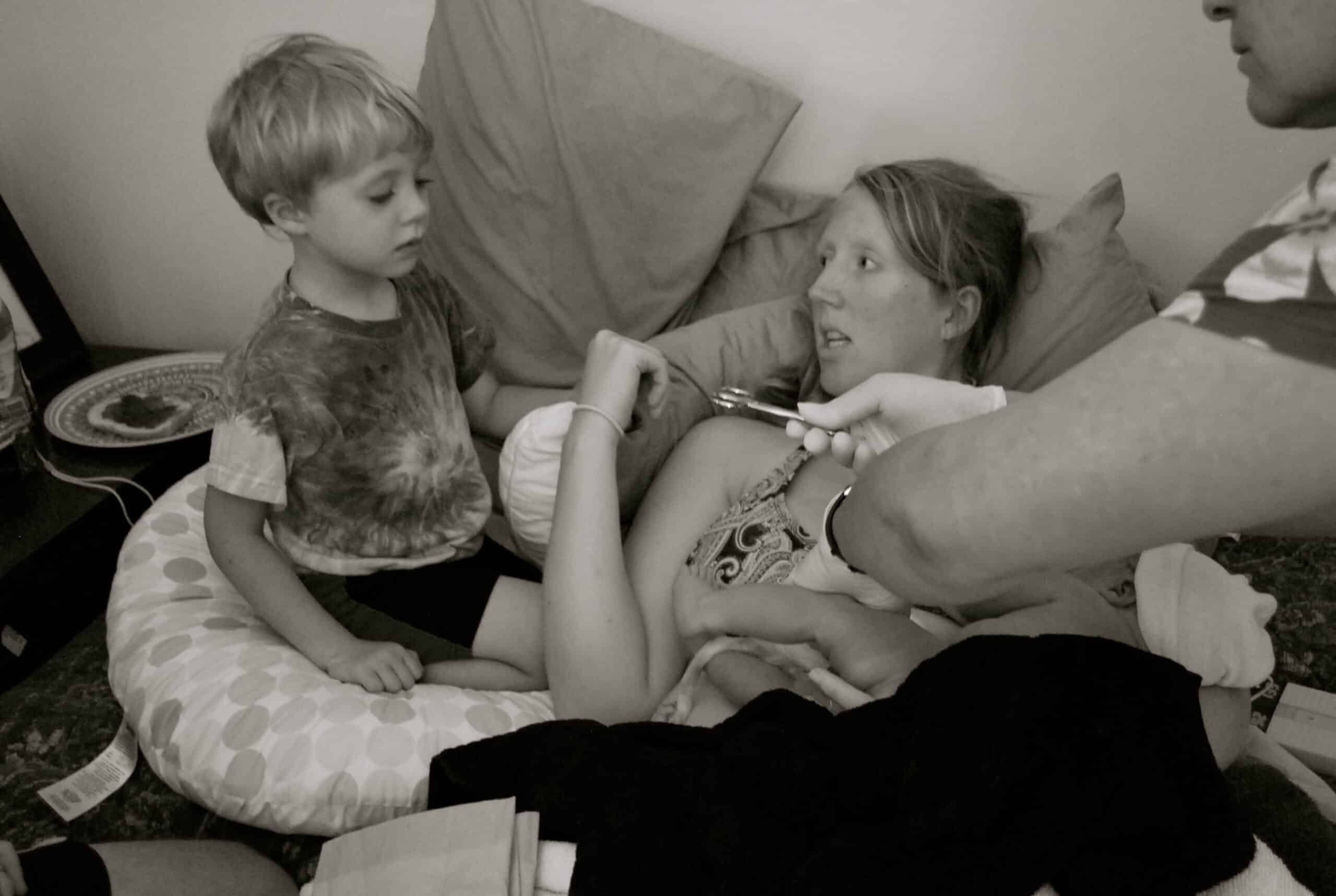 Chunks of vernix floated in the water. Debi came over and rubbed him with a towel. Liam and Nick came down with my Mom to meet their little brother. I stayed in the tub for a little while and then noticed a lot of blood in the water. I asked Debi if it was a normal amount and it was. It was just the placenta separating from the uterus. The assistant felt the cord and said it had stopped pulsing. I was surprised at that, as it had only been about a minute. We realized later, that the cord was actually still pulsing. It was cool, even after it came out, it continued to pulse and didn’t stop for a while.The cord stayed in tact though. I soon got out of the tub after a handful of photos.