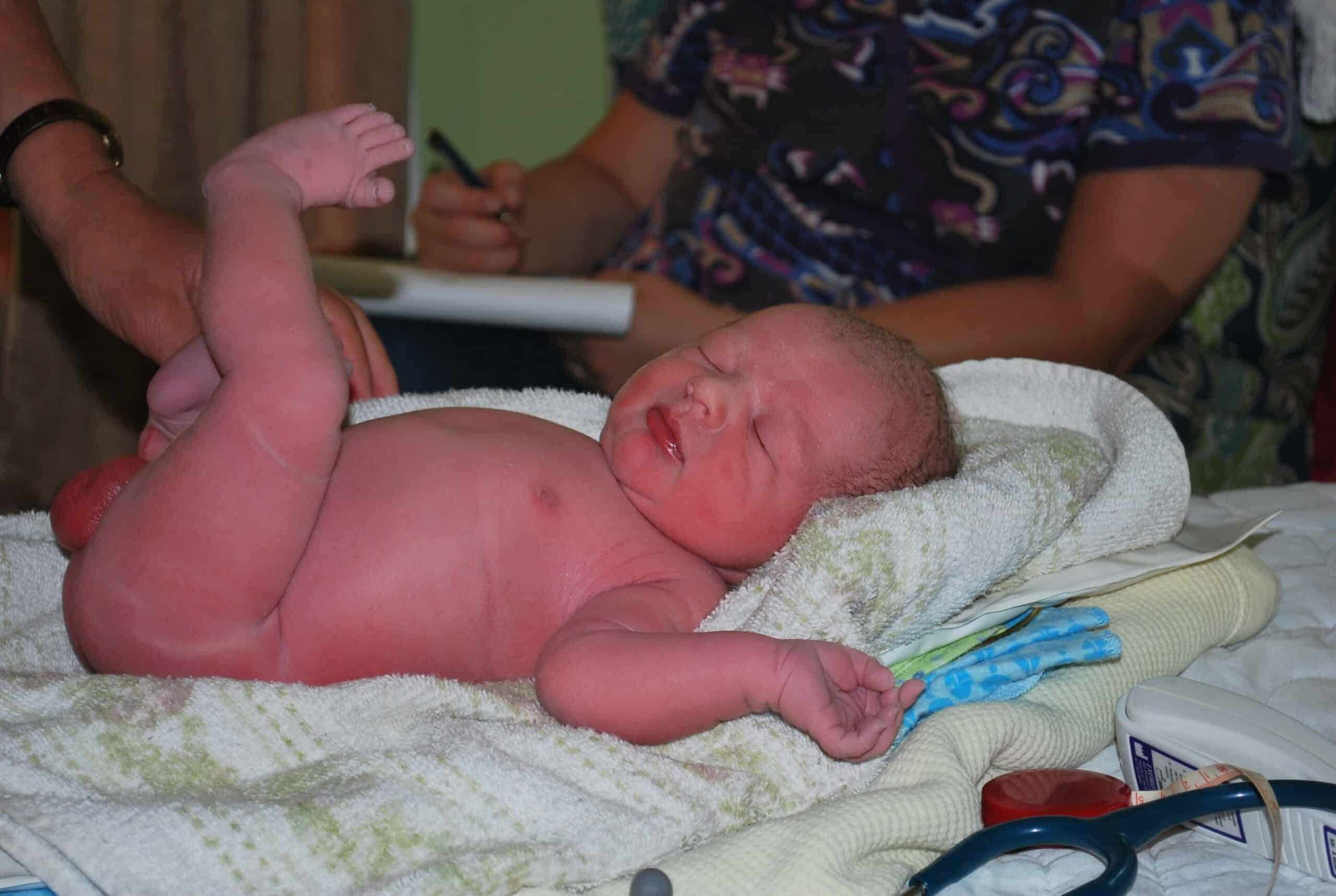 Debi asked right before he was weighed how much I thought he weighed. I said, he looks similar to my other two when they were born, probably 8 lbs at least. I was surprised with him being born at 37 weeks. Sure enough, I was close. He was 8 lbs 5 oz, 21 inches long with a head circumference of 14 inches. He did show signs of being early. His muscle tone is a little low, the cartilage on his ears is very soft and he was covered in the most vernix I’ve ever seen on a baby. He is perfect though and nursing wonderfully now.