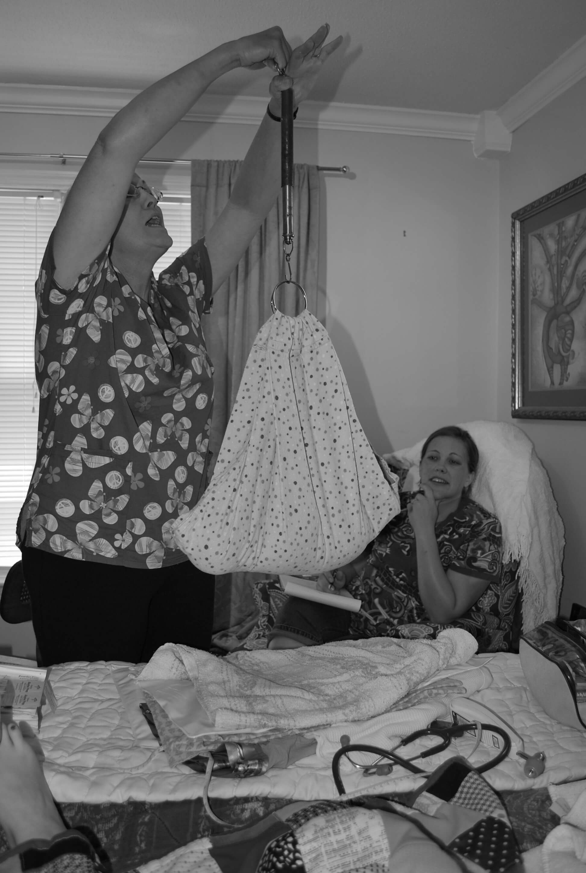 I believe around this point, Damon called Debi to let her know that things were picking up. She said that she would be here soon. I went downstairs and started to get the last-minute things I wanted ready in the birth room. I made sure that the video camera was set up properly, making sure that it would record. I asked Damon to call Amy around this time too, but he thought I had meant to just call Debi. I reminded him to call Amy and he did. Around 10 am, Debi and her daughter Rachel (her assistant) arrived. They were really great when they got there.