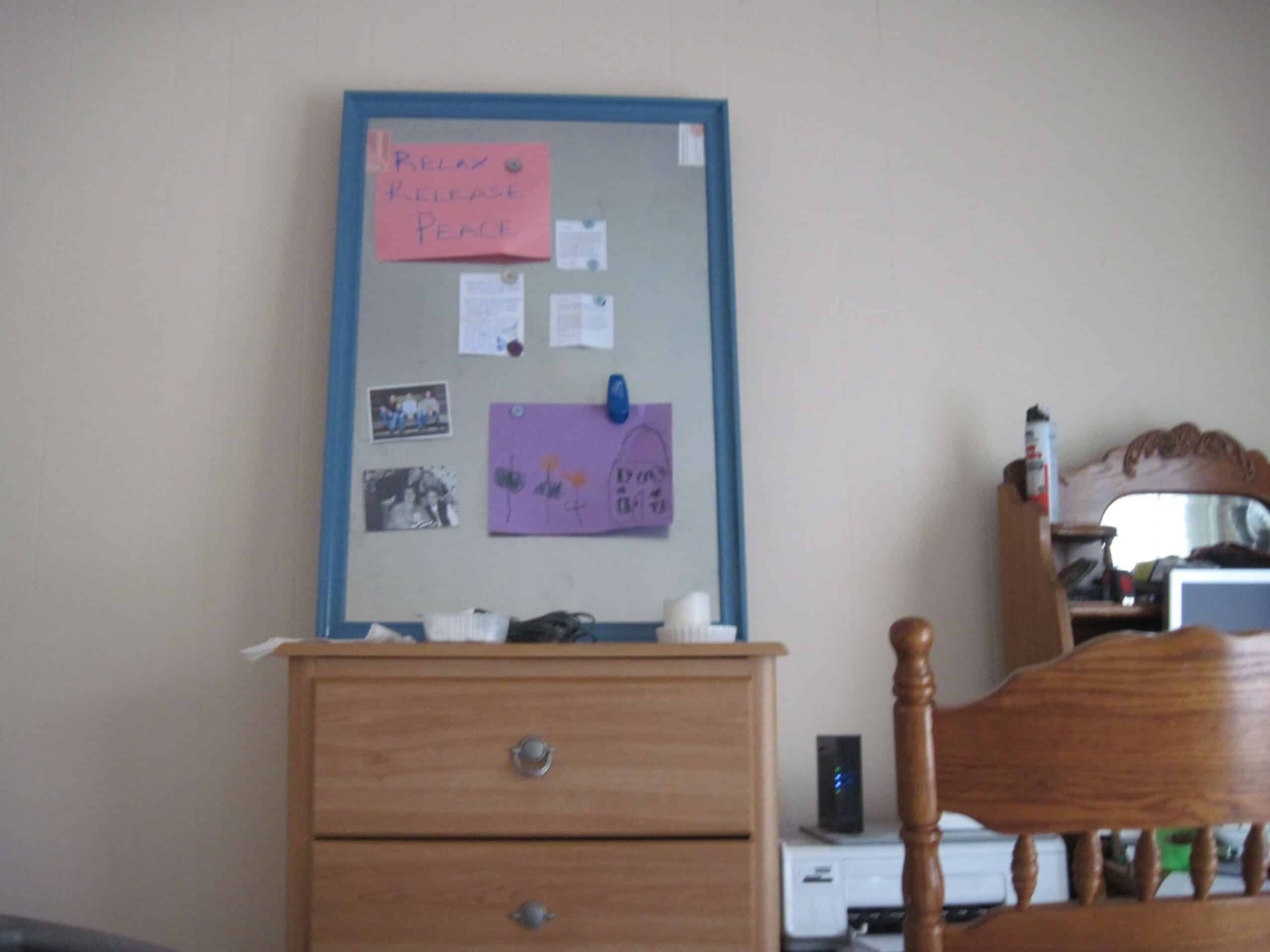 I had written the words, Relax, Release and Peace on it, just about thirty minutes before. I hoped that it would remind everyone in the room the cue words that I would need. Liam also had a picture that he had drawn specifically for when I had the baby put up on the board. I remember looking at the magnet board and I really thought it was about to fall. I asked someone to go catch it. My husband went over to it and asked what was behind the board. My response, which wasn’t so nice, but I started really cracking up, “Ohh, it’s just your stupid golf balls! Bwhahahahahahaha.” I have no idea why I thought that was so funny but in the moment when I was nearing transition, I thought I was hilarious.
