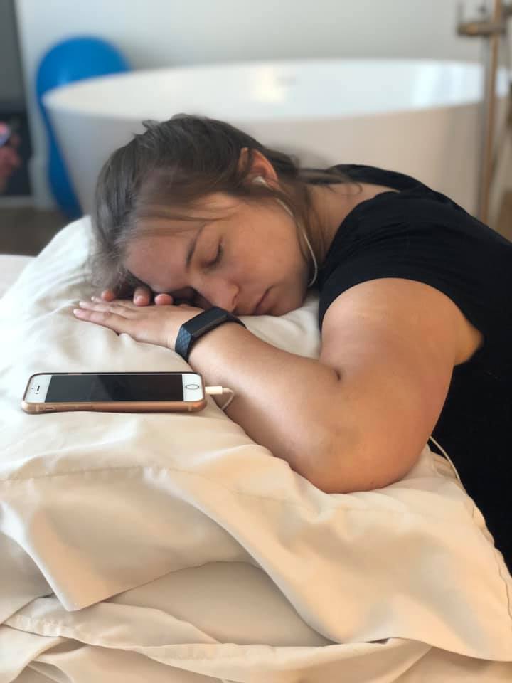 At 9:45 we arrived at the birthing center. My waves were very intense in my lower back and were about 3-5 minutes apart. I stayed in hypnosis the entire time. My sister and husband brought my bags into the birthing suite while I sat on a ball and listened to my hypnosis tracks. During every wave, I would do a finger drop and one of my partners would place their hand on my shoulder (Doing the Relax cue which brings you deeper into hypnosis). At 11:15 my midwife checked me and said I was a stretchy 7/8. I had a few more waves lying in the bed.