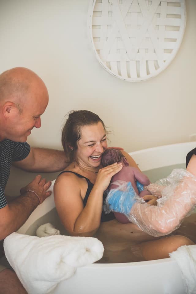 “I went to the bathroom around noon and my midwife told me I should have a few waves while I was sitting on the toilet. 2 waves later, my water broke. I got into the tub and had my husband turn on the Pushing Baby Out track (Hypnobabies track just for pushing) out loud”