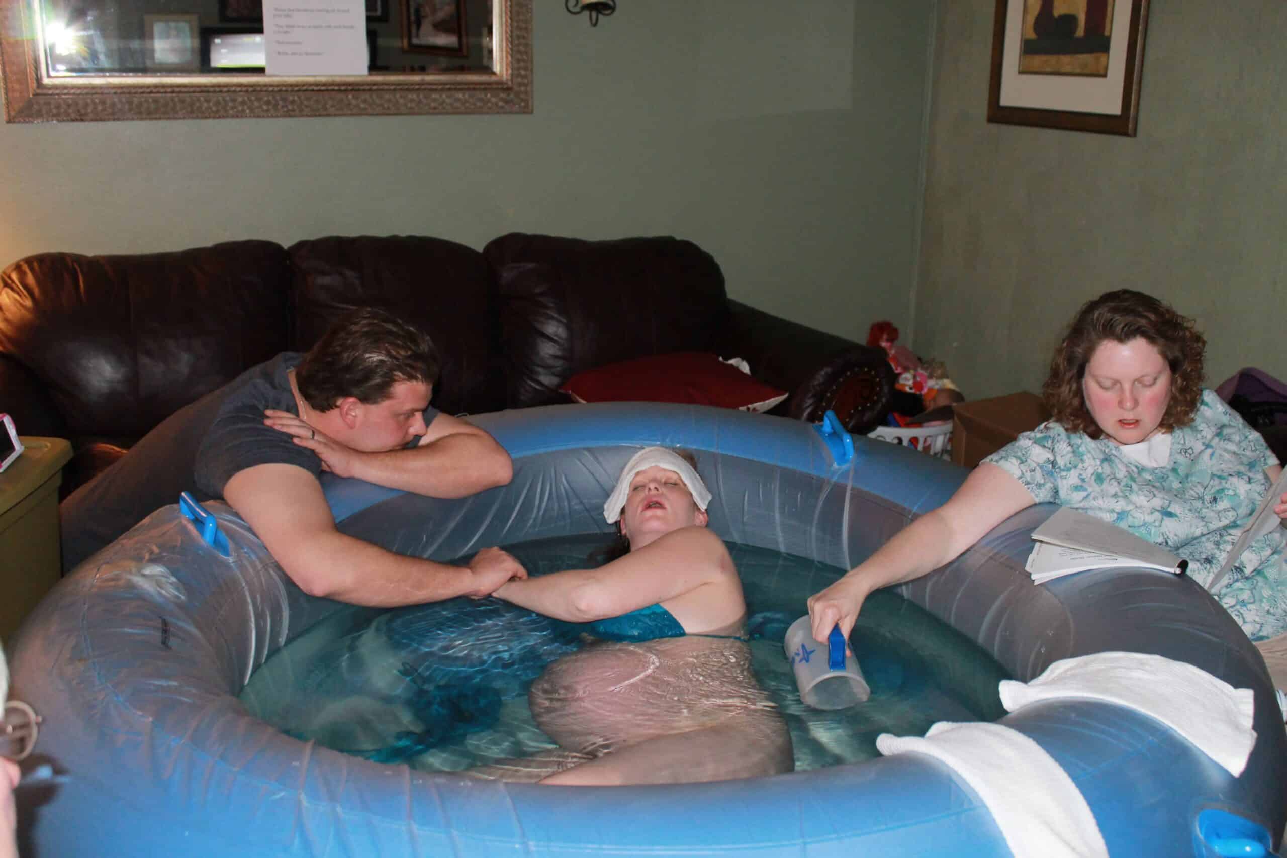 Finally, Jeff said, “If you don’t call Jenna, I will”. So I agreed. Jeff called her for me as my pressure waves were about 3 minutes apart. She was at yet another birth (mind you there was a full moon the next night and a storm brewing). She would send Barb back over to assess me. Barb came and checked me, I was at a 6-7. She said I was so soft she could stretch me to an 8 if she wanted. I was happy about the progress and with that note, I wanted to be in the water now! During this time, Jeff had begun reheating the birthing pool and was just about ready. I called my doula and said we were back on and to come on back.