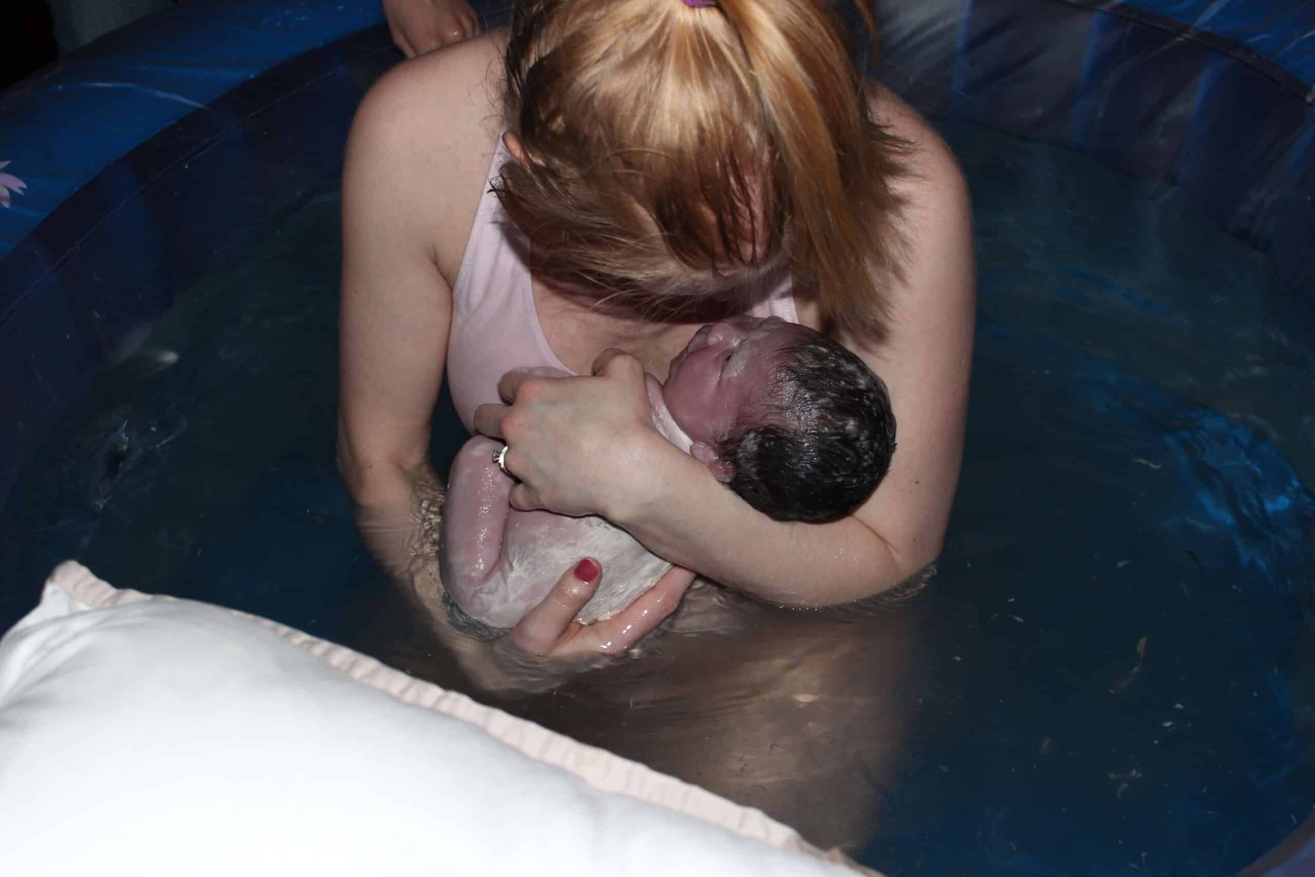 We arrived home around 6 pm. I felt relieve to be in my own space. I went right up to my room and started arranging things. My mom helped with the kids and Lucas came up and hooked up the hose to fill the birth tub. My mom then came up to time some of my PW’s and light the candles on my dresser. I am glad I listened to my body and came home. It’s just what it needed. My PW’s started to pick up and get stronger. I called my friend Margo and updated her and told her to head over when she could and to let our other friend Rachel know. Then my mom told me my PW’s were about 3-4 min apart so I called the birth center message line to page my midwives. Clarice called right back and I let her know it was time to come. It was around 7:15 pm. Lucas bathed Yalana and put her to bed just before everyone arrived around 7:45ish. Then he took care of Austin. My mom took pictures and Margo and Rachel took turns massaging my back during PW’s. I would not describe the PW’s as painful at all. They were strong but not painful. I used my Hypnobabies Peace cue to breath my hypno-anesthesia all through my body, special place technique and ‘ah’ vocalization to relax my body during each PW. The stronger the PW’s got the more excited I would get and coming out of each PW I would smile knowing that soon I would be holding my baby girl. At 8:45 pm I decided to have Clarice check me. I was 10 cm. At that point my husband and son had come upstairs which happened to be perfect timing. Clarice suggested that I sit on the toilet for a while. Sitting on the toilet was just what I needed. After two pressure waves my water broke. As soon as it did I felt increasingly pushy. I told everyone to get me to the birthing tub. I knew with the next PW I would be pushing her out. The transition to the tub was the most challenging part. A wave of nausea hit me and walking was not the most comfortable position with all the pressure but with help I made it to the birthing tub. I put one leg in and then up came the cookie and toast I decided to eat when I got home (it sounded good to eat at the time). Thankfully, Clarice had the trash right there for me. I felt so much better after that. I got into the tub and the water felt too warm for me especially since it was 77 degrees in the house because of the crazy March weather and our air-conditioning happen to not be working. So they added some cold water. When it felt right I got down on my knees in the water… Ahhh the water and being on my knees felt amazing. I had a little break before my next PW. Clarice checked the baby’s heart tones and my husband gave me a kiss. Then I reminded Austin that I might make some grunty noises like what dad does when he lifts heavy weights. He understood and I could see the excitement in his eyes. He had been waiting for this moment for weeks asking me everyday if I was going to have the baby yet. As I started to feel the next PW I closed my eyes and put my head down on the pillow in front of me. I used my Peace cue to breathe my Hypno-anesthesia out in front of my baby’s head as I started to bare down with the PW. I felt lots of pressure and a slight burning sensation but that was it. I knew it would only last a second and I pushed a bit more as I kept me hand on the top of her head and out it came. I checked for a cord and so did Kendra my other midwife. With the next PW I bared down again and out she came right (9:10 pm) into my own two hands. I picked her up out of the water and held her close to my chest. We did it baby girl! I was filled with joy and excitement. I sat back in the birthing tub and enjoyed looking at her and soaking in the miracle of life. I also got to feel her pulsing cord and watch it self-clamp. After the placenta came out my mom cut the cord. Analiese was handed off to her daddy and I was helped back into bed. After some pictures Kendra did Analiese’s newborn exam right on our bed. The most surprising part was how much she weighed. We all guessed a weight and we were all wrong. She was 9 lbs 4 oz! We took more pictures then my mom helped Austin to bed. Lucas made me eggs and toast and Rachel helped feed me while I nursed Analiese. Kendra fixed my small tear. Clarice did the placenta prints and Margo and Rachel helped clean up. It was perfect timing for her to come just before bedtime.