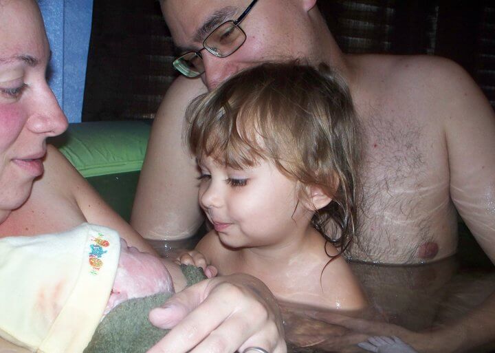 Camryn wanted to join the pool party so my husband brought her in while she checked out her new little brother. A few minutes later I started having contractions again and was dreading delivering the placenta. Not that it’s really meant to be `fun’ but I was unhappy with how I delivered Camryn’s placenta so I was trying to do this one better! We knew it was detached so I just kept kind of checking to see if I could feel it. I stood up for a few minutes (at which point Camryn walked around behind me…I asked what she was doing and she said, “looking at mama’s booty!” It was a definite cute moment!) After a few minutes, I decided to try squatting and soon I could feel with my hand that it was coming down. It had that same cauliflower feeling that his head had and it felt SO big that for a moment, I was afraid it was a twin! With the next contraction, I gave a few little pushes and it came out gently…so much nicer this time! I pulled it out of the water and was glad to find that it wasn’t another baby, but just one of the thickest placentas my midwife has ever seen…no wonder it felt like another baby!