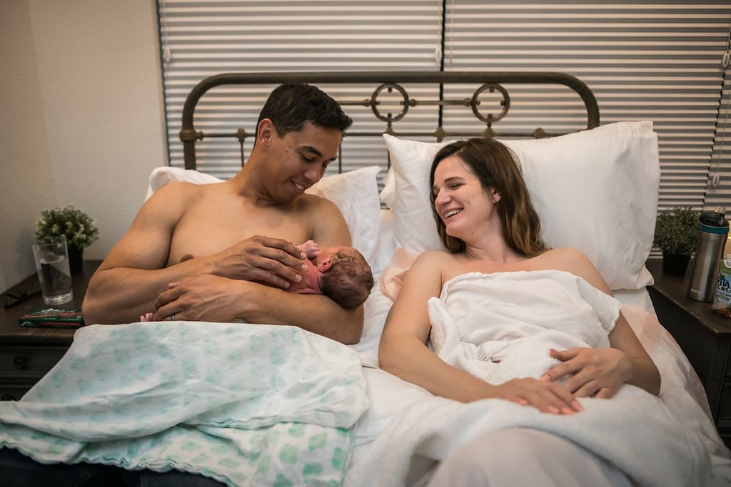 I came out of the bathroom and had another powerful wave leaning on Mike. This time I felt the need to hold my perineum, and right then with a pop, my bag of waters released and following the waters I could feel a little head and tuft of hair beginning to emerge! “Okay, I guess I don’t have a lip!” I said. At this point, my wave was bringing him down quickly, and I began to breathe through it as to not push him out too fast. I don’t know if I said it or just thought it, but I remember telling my baby we needed to slow down just a little bit.