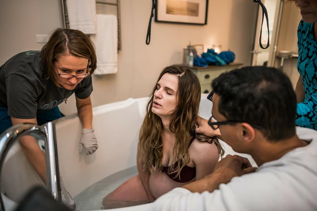 My wave ended and my midwife offered me the tub before the next pushing wave. I waddled into the tub with just enough water for him to be born in. With another wave I focused on my breathing, allowing my perineum to stretch. As it finished, I took a short break, then finished pushing my baby’s head out between waves so I could control the speed at which he emerged and prevent any tearing from happening (it worked! Not even a slight tear!).