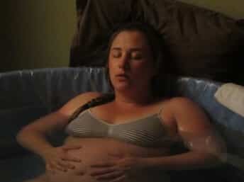 Soon I was feeling like it was time to get into the tub. The midwife wanted to check me first, and I was a little discouraged to hear I was “only” at 6 (this was just after 2:30). A few waves later I was in the tub, and it felt amazing! I tried a few different positions to see what felt best, and finished listening to Easy First Stage. My husband wondered what to put on next, and suddenly I felt like he needed to put the Pushing Baby Out track. He put it on but I don’t think I heard a word of it, I was in my “zone” at that point!