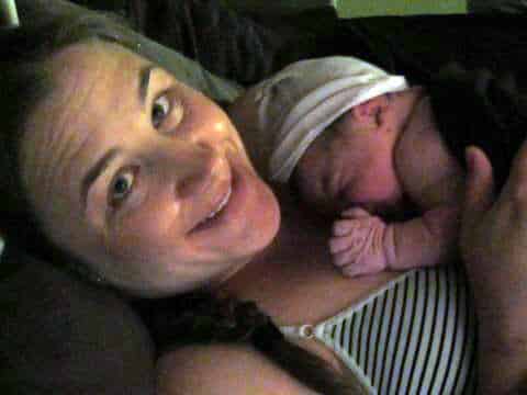 She had a short cord, and it actually tore as they handed her up to me, so we had to clamp it and get out of the tub right away. Everyone seemed calm about it, so I didn’t stress, just climbed onto the bed and snuggled my baby as they massaged my belly and delivered the placenta. She cuddled a bit skin-to-skin, then she latched right on and nursed really well!