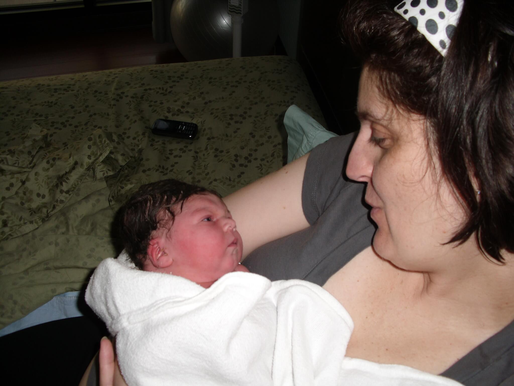 Again, looking back at the video, I see myself making a lot of grunting noises, but also being completely in control of my body and being able to follow Christine’s directions. She told me to slow down and she told me the head was out, I could feel her between my legs. Christine had enough time to say the she can see my baby’s face and that she is really cute when with a final push her shoulders came out and Emma Berniece was caught in mid air, born at 8:23 am.