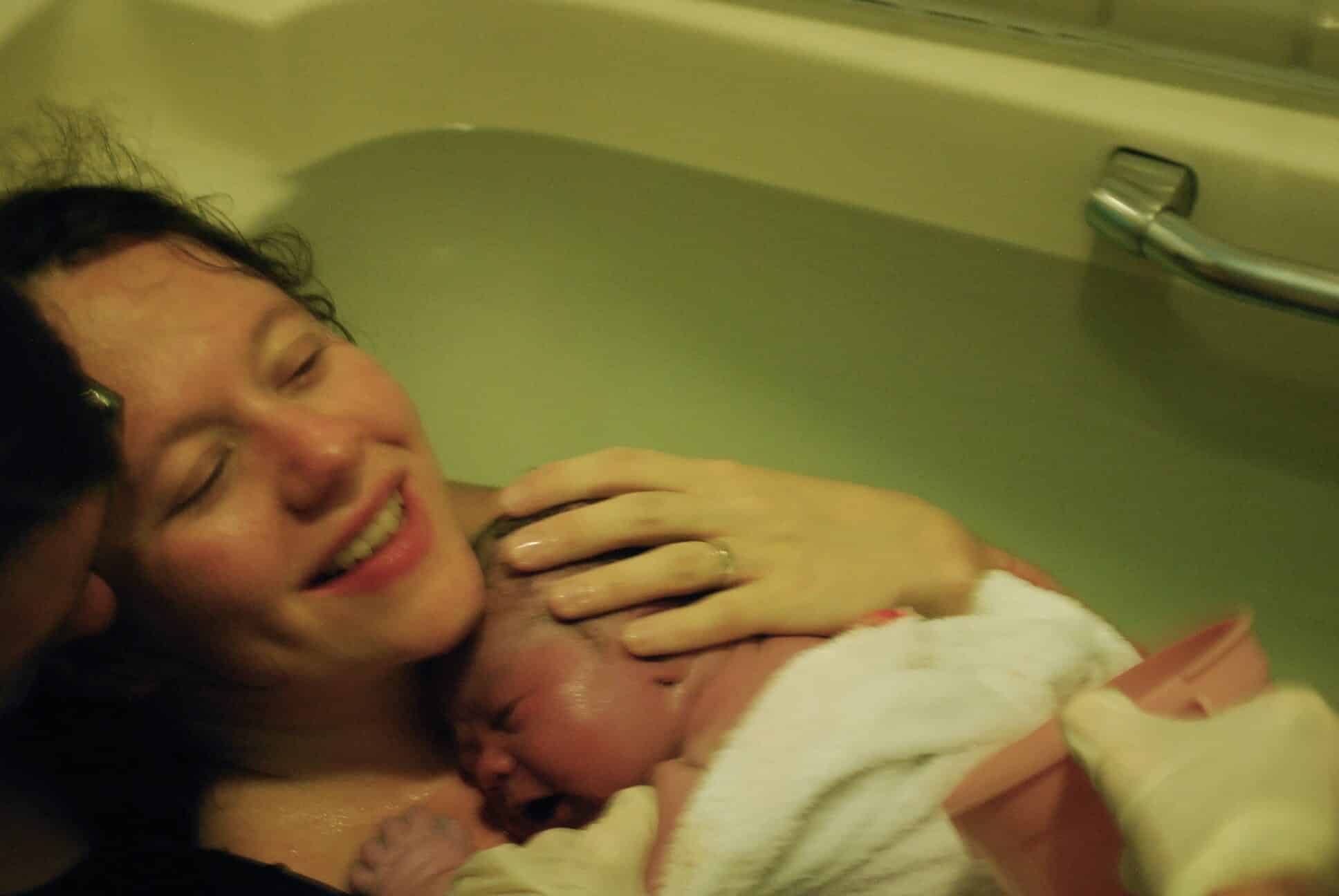 Being in the water felt wonderful. I continued listening to my Hypnobabies tracks, and soon Haidee joined me in the tub. My sister played photographer, and another midwife, Laurie, joined Jill because there was a chance that another birthing mom might be arriving before I gave birth. No one else did arrive during my time in the BC, so I had both wonderful midwives by my side the entire time, mostly being quiet and letting me do my thing, pouring warm water over my belly, and occasionally making suggestions for positioning my legs and body in the tub for optimum comfort.