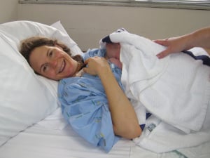 Next thing I knew, Tania was saying “Ok, we need to flip for the shoulders.” This really took me by surprise, since everything had gone so smoothly up until now. I was on my hands and knees. Tania and Leeann helped me over onto my back and flexed up my knees by my sides (McRoberts manoeuvre). I heard Tania say, “That’s got him. He’s turning. . . Here he is!” I felt our baby’s shoulders come out, and then the whole slippery length of his body. And then he was on my chest, warm and sticky and perfect!