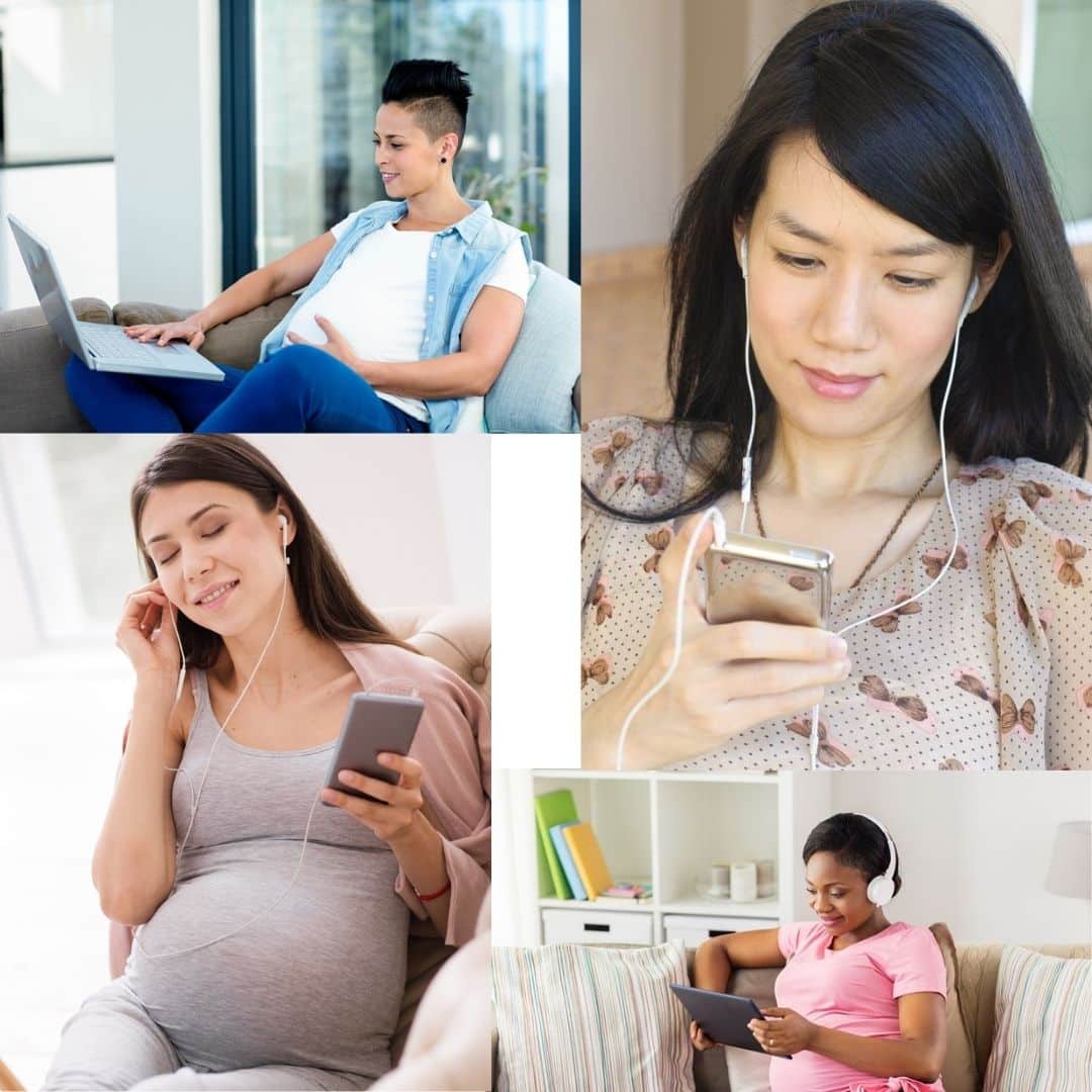 Safety – Please note and remember: Hypnobabies *hypnosis* tracks cannot be listened to while driving, walking, running, holding a baby or child, operating machinery, cooking dinner, showering, doing yoga or doing anything else that requires your full concentration since it is NOT safe. These tracks have hypnotic inductions and deepening suggestions on them and on each one you are reminded in the introduction that is on every hypnosis track that you must listen to them ONLY when your eyes are CLOSED, and you are sitting down in a *fully supported position* where you can relax all muscles of your body – in a cushy chair, or lying down, or on a birth ball/leaning over a supporting bed or sofa, etc. YOU MUST listen to your Hypnobabies hypnosis tracks *safely*, as directed, when you are practicing; we care about you!
