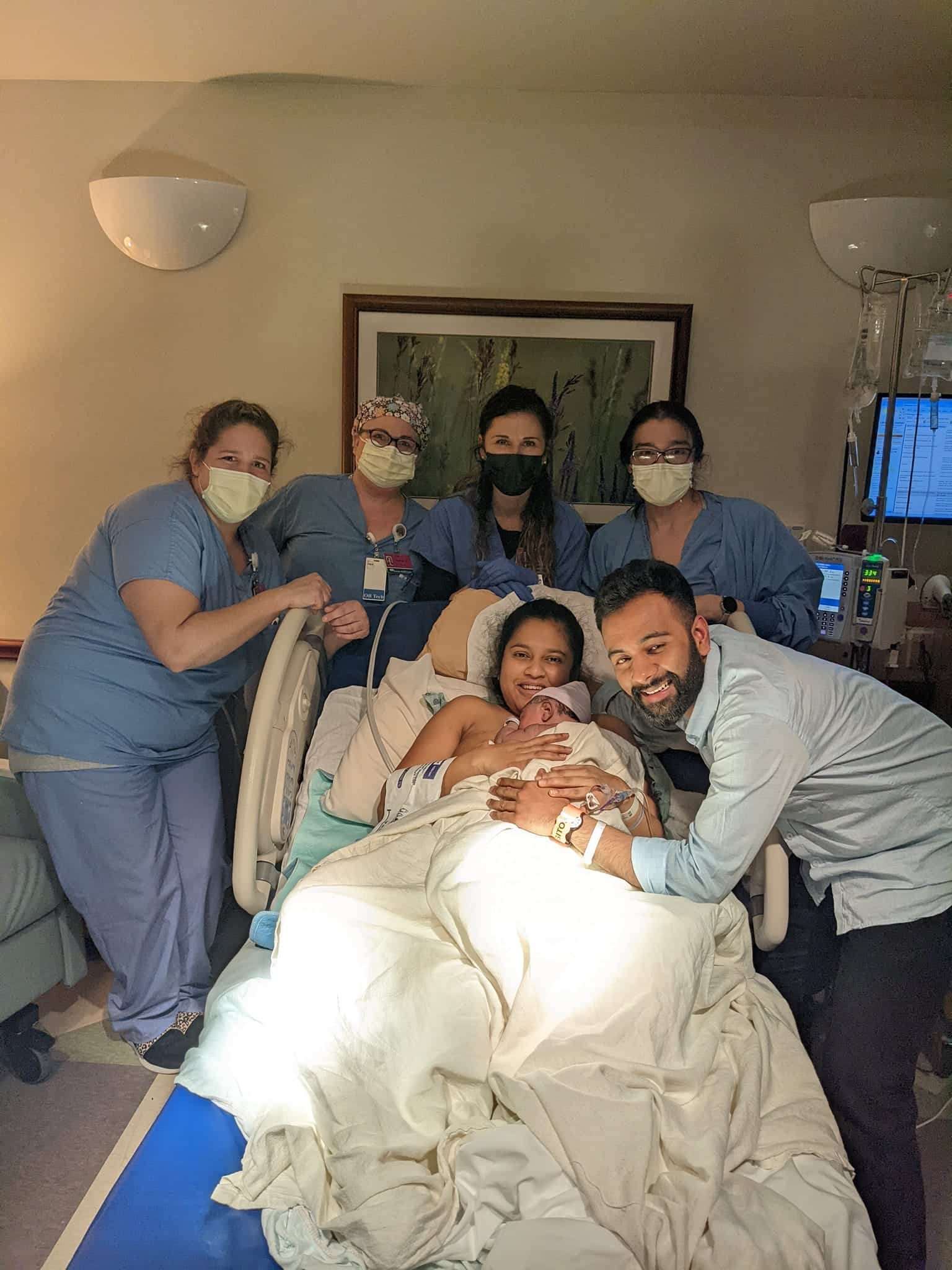 I was planning to insist that I push on all fours or side lying etc. However, when it was time, I couldn’t argue as I was shaking too much to put weight on my legs and couldn’t bear the pressure caused by the baby’s position. Lying on my back, I started pushing around 5:15 PM and the whole crew was impressed with how effective my pushes were and how I was calm and even smiled between waves. My nurse guided me to breathe slowly and deeply through the waves. I was completely in the zone and had my Center switch (Hypnobabies tool for remaining in hypnosis while being able to move, etc.) throughout. We all joked and even guessed the baby’s birthing time. When offered a mirror, I refused. My husband was amazed with my progress and shared that he could see the baby’s head. My baby boy was born at 6:24 PM and the entire staff was impressed with the whole experience. As predicted by my doctor, my baby boy was fairly big for my size (both me and my husband and everyone in our families have been about 6lb babies and my baby turned out to be 8.5lb and really long). Since he was a big boy, I ended up with 2nd degree tears while birthing his shoulders, which my doctor stitched up right away after I birthed the placenta 8 minutes after my baby was born.
