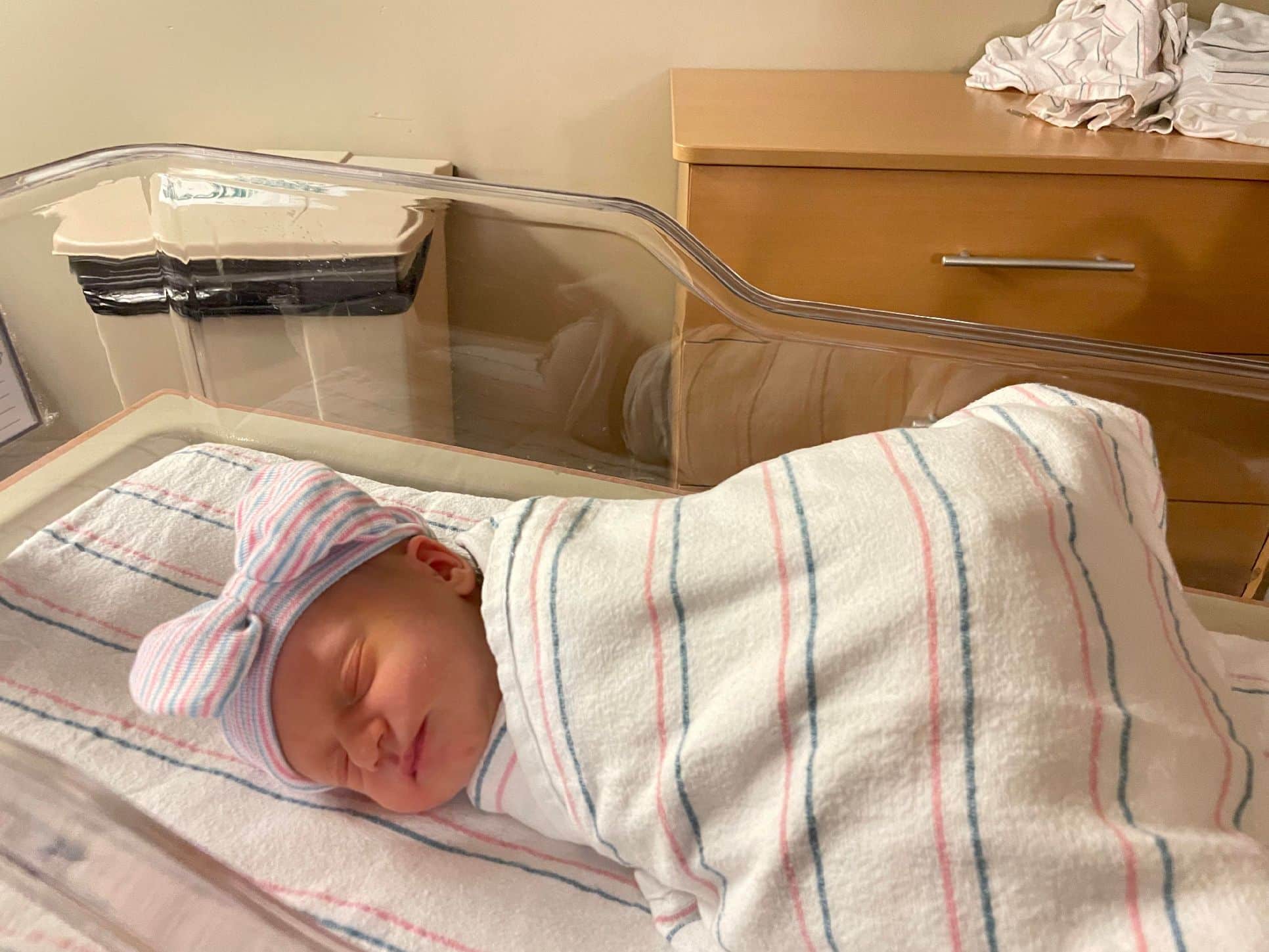 My doula said, “look they have a birthing tub for you!” My waves were long and nonstop! So, in my blur, I had a few seconds to open my eyes and see the tub folded up. I was the first person in the hospital to use the tub, so there was a lot of commotion as they tried to figure out how to set it up. I had expected to use the permanent bathtub in the bathroom, so this was an awesome surprise. At one point, they asked me if engineering could come in to get the water flow to increase. I remember hearing cheering when the water started gushing from the shower because engineering removed the resistors. I remembered thinking I could’ve told you that! LOL, I didn’t see a thing because my eyes were closed the whole time.