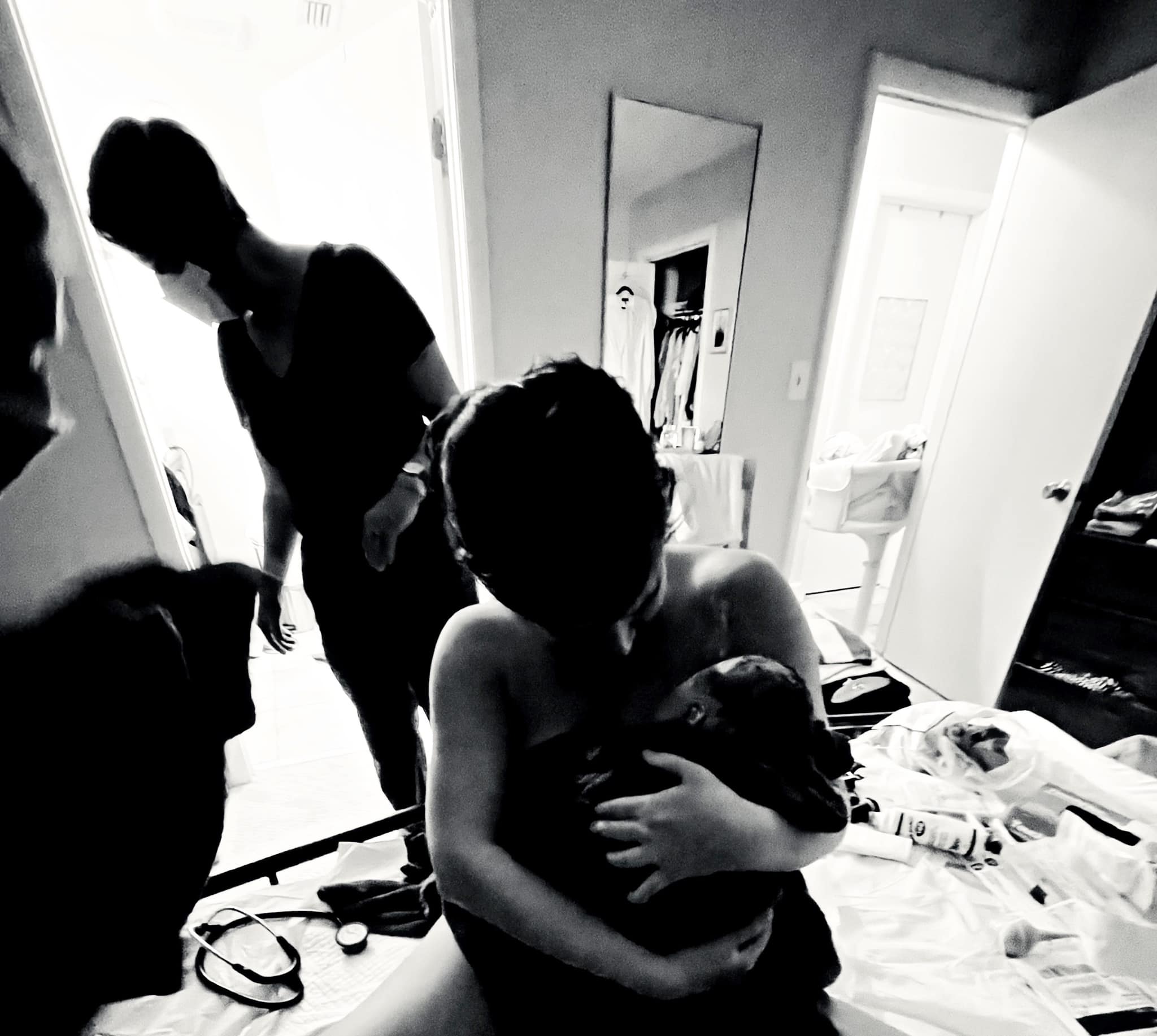 I was lying on my side as baby started crowning, and my husband laid next to me holding both my hands and giving me cues. I squeezed his hands so hard and pushed like I was taking the biggest poop of my life. It was a strange, but powerful moment. Finally, they said the head was out, I asked if baby was ok and they said yes, I just need to push a little more to get her body out, so I took deep breaths and with a couple more pushes my sweet slippery, vernix-covered baby was in my arms and on my chest for skin to skin.