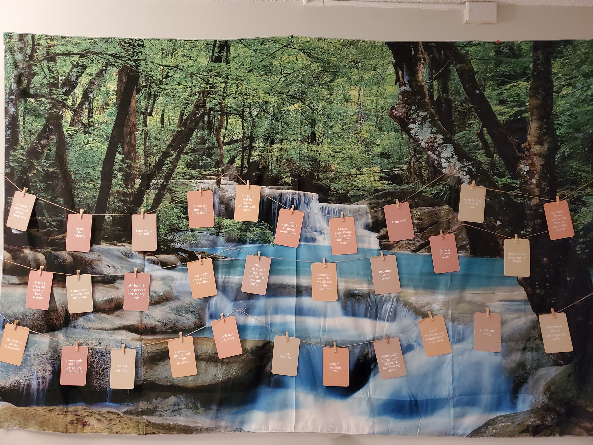 The day prior I decorated my walls with nature backdrops and birthing affirmation cards strung all over them.