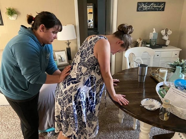 Connor drank his morning coffee outside because I was nauseous and couldn’t handle the smell. Connor used our Hypnobabies cues, and our doula provided counter pressure as I rode each wave. We had Easy First Stage (Hypnobabies main birthing time track) constantly playing out loud. Every time it turned off, I asked for it to be started again right away. Birthing Day Affirmations, Deepening Your Hypnosis (Hypnobabies track to deepen the level of hypnosis), and Easy First Stage is what we listened to most. We used multiple positions hands and knees, sitting on the birthing ball, standing leaning over our table, and side lying in bed. Our doula was in contact with our midwife and let her know when she thought she should arrive.