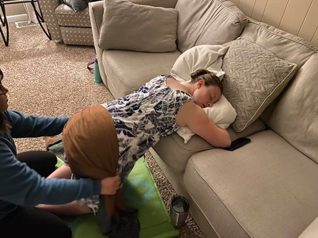 My doula suggested the miles circuit to help with babies positioning. We did the miles circuit. While I curb walked, Connor played disc golf and gave me sips of water in our backyard. Then we ate dinner and went to bed Saturday night at 9 pm, sleeping between the waves. We played our Hypnobabies tracks the whole time we slept but around 2 am Sunday morning I woke up completely to more intense waves every 2 minutes and the Hypnobabies tracks were not playing. At this moment, I freaked out and let my mind race. Connor helped me get back into focus and got our Hypnobabies tracks playing again making me instantly calm again.