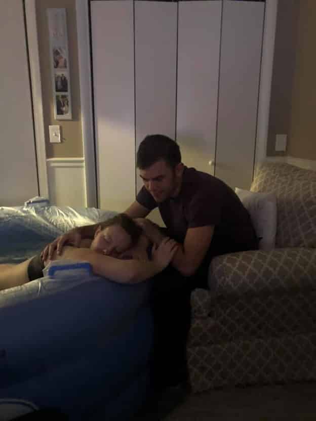 We texted our doula that we were ready for her to come. I got in the shower and Connor texted the midwives to let them know my waves were every 2 minutes lasting 1 minute. Connor would stop texting and help me through each wave using our Hypnobabies cues. I got out of the shower put my hair up in a bun and put on my birthing gown. I went to the living room and worked through waves on my knees leaning over the couch. My doula got to the house at 3:30 am and she provided wonderful counter pressure which made my waves more manageable. My doula and Connor gave me sips of water and crackers between waves.