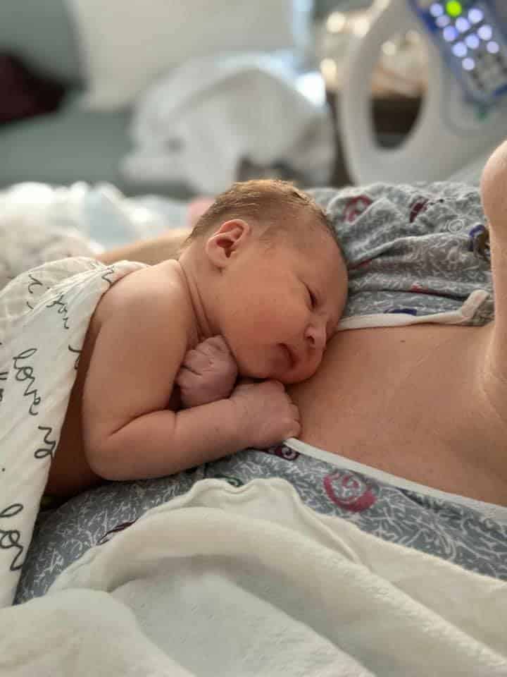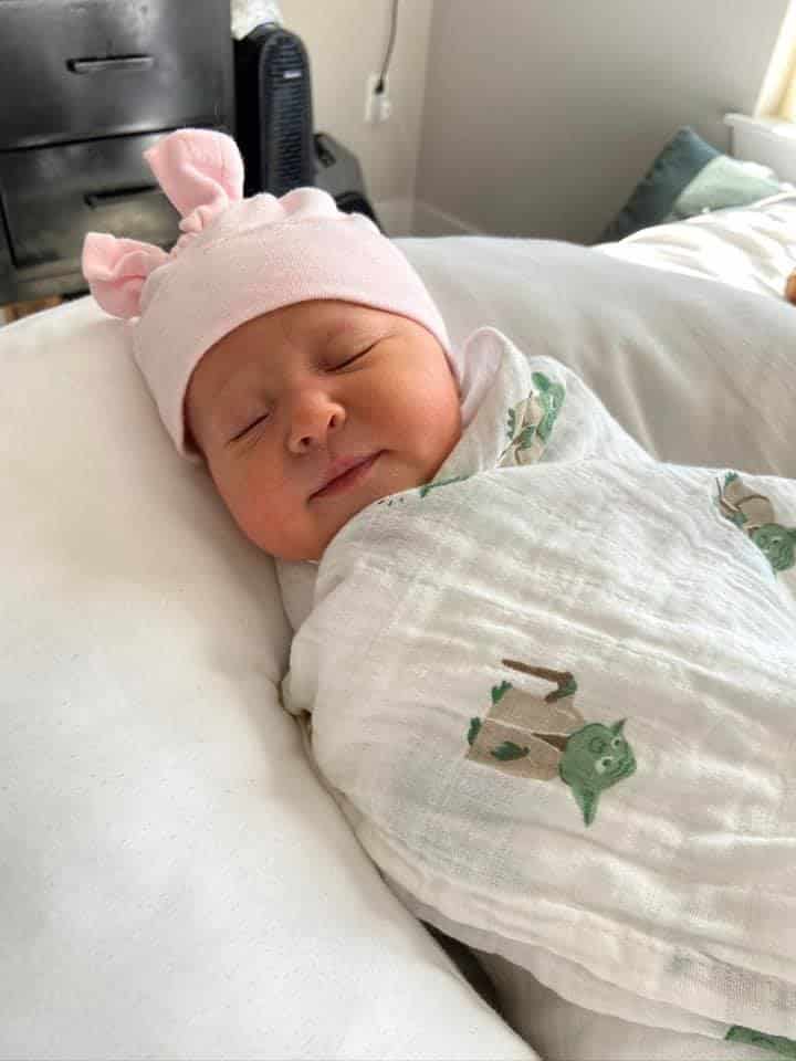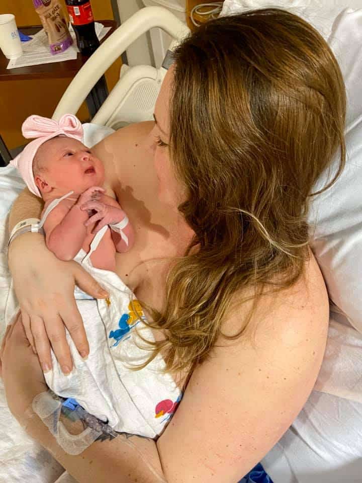 The next morning (now over 24 hours since my water had broken and in birthing time (Hypnobabies word for labor), I was still only 3 cm, although I had effaced some more. My (non-Hypno) Doula arrived around 10 am and offered suggestions for positions and things we could do to get things moving. The Peace cue (Hypnobabies cue for instant physical comfort) was my favorite for pressure waves and really helped ground me. I also used the Release cue for waves but also to go deeper into hypnosis. My husband and Doula both helped to reinforce these throughout my birthing time. We knew that if we were to reach 48 hours, we would have to transfer to the hospital per the birth center/laws. Hours went by of doing everything possible to get baby down and out but I ultimately made the decision to transfer at about 42 hours in and only being 4 cm and absolutely exhausted. Once we arrived at the hospital, I had an epidural administered so I could get some much-needed rest. Within an hour I was fully dilated and ready to push. The downside of the epidural was not being able to push in a very helpful position. I pushed for an hour and a half and then baby girl was here!