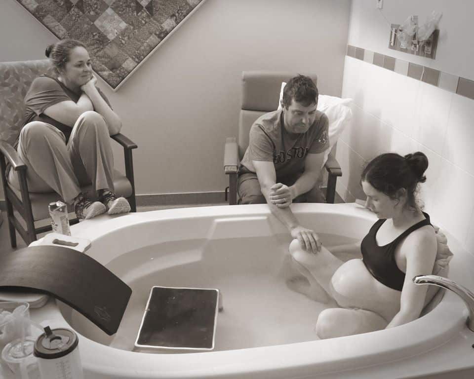 I was admitted and monitored with my hypno-doula advocating for me to sit on the ball and not get in bed. My husband was able to start pushing on my back during each wave, which relieved discomfort. The nurse remarked I didn’t seem to notice to the smaller waves she saw on the monitor. I was smiling and talking between waves but shaking all over. My midwife asked to check me. I was concerned I was too comfortable and maybe overreacted going into the hospital. She disagreed saying she believed I was pretty far along. I was dilated to 7cm and 80% effaced! She pronounced I was having a baby tonight. They prepared the tub room for me. I wasn’t listening to my hypnosis tracks until I got into the tub, I just switched off (Hypnobabies technique to for being deeply in hypnosis) during each wave.