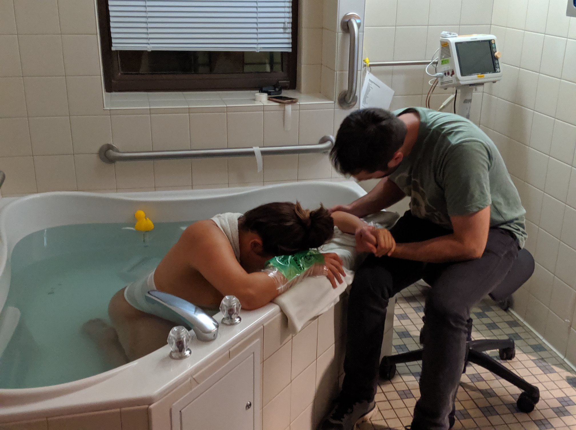 My husband looks at me with surprise. Everyone was completely shocked that I was fully dilated and I was so calm. I had planned for a waterbirth so they take me into the room that has the birthing tub. I had a couple rounds of pushing on the bed while they filled the tub and the midwife gave me counter pressure to help. Once the tub was ready–which it felt like they filled it in 5 seconds, I was helped into the tub. The water was soooo relaxing. I was soooo happy that I was able to be in the water. I have my husband turn on “Pushing Baby Out” track (Hypnobabies track just for comfortable pushing). Our doula arrived shortly after that and she was also shocked that I was able to be at home for so long.