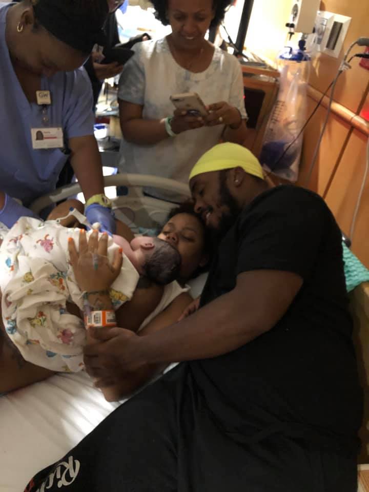 Every time a wave came I stopped and just focused, leaned on my partner and became in tune with my body. By 5:00-6:00 pm the midwife checked me again and wow I was 9 cm but my water still hadn’t broken. So, I continued to do squats and exercises to try to get it to break. This midwife was getting off at 6:45 pm. So around 7-730 pm, a new set of midwives and nurses arrived and I decided at this point that it was time to break my water. My birthing time (Hypnobabies word for labor) had been going on for about 30 plus hours at this point and tried to do everything I can do to get my water to break naturally but it just wasn’t working. So, my new midwife broke my water around 8-8:30 pm. And I immediately had the urge to start pushing. So, I put on my Pushing Baby Out track (Hypnobabies track just for pushing) and began to push! It felt like I was pushing forever!