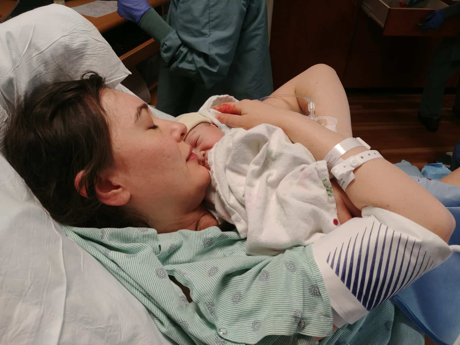 Finally, after fifteen or twenty minutes of pushing, I felt an amazing stretching sensation, a small sharp twinge, and the baby’s head and body came shooting out in one big push. The doctor laid the baby on my belly, and I put out my hand and felt a tiny, warm, slippery, wiggling body. I opened my eyes and saw my daughter Isla for the first time. She was red, dark-haired, and covered in white vernix. After nine months of waiting for her, I couldn’t believe she was suddenly out.