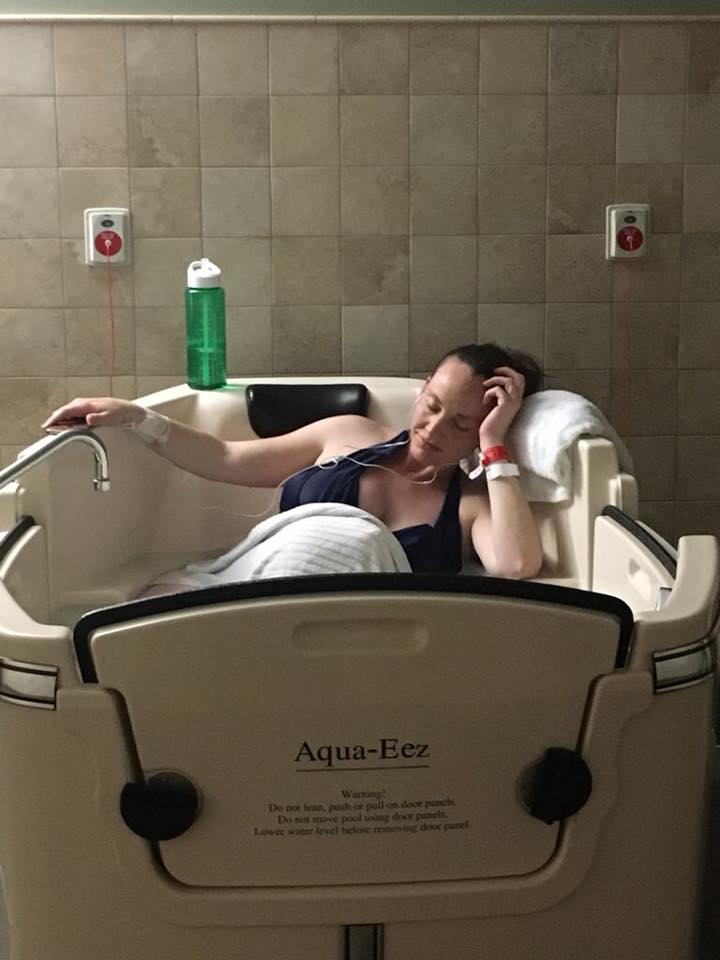 Once we got to the hospital around 11 a.m., my birthing time (Hypnobabies word for labor) stopped almost completely. We decided to stay anyway to see what would happen, and around 6 pm, we decided to break my bag of waters. It was a difficult decision because I knew that if my birthing time didn’t restart after a certain amount of time, they might put me on Pitocin, but fortunately an hour after the procedure, things started to heat back up again. I immediately got into the giant tub in the bathroom attached to my birthing room, and listened to Easy First Stage (Hypnobabies powerful hypnosis track for birthing). I loved that one too! There were many moments when I wanted to respond back to the track with: “Yeah! That’s right! I got this! Exactly! Amen!”
