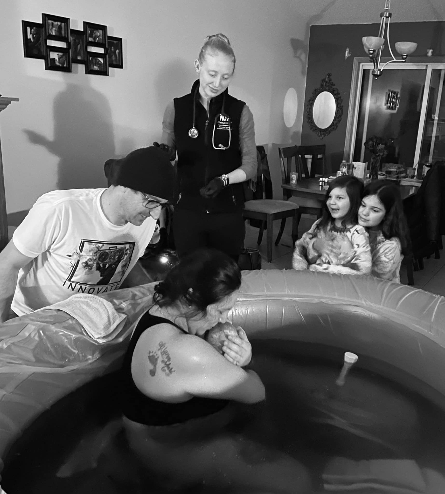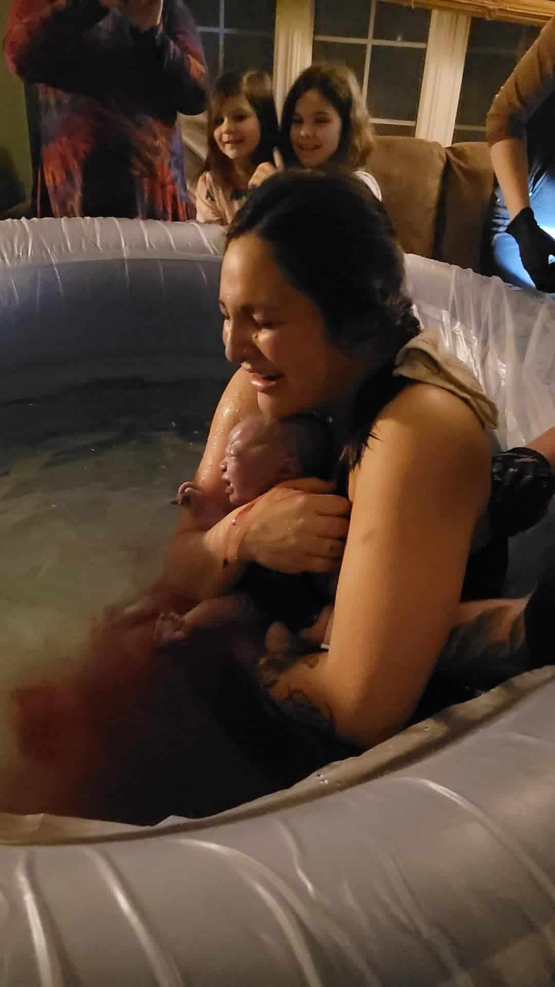 My water broke at 10:35pm and to my surprise I began to feel pushy. I thought to myself there is no way I’m ready to push- it hasn’t been long enough. The midwives noticed the change in my sounds and joined us around the pool. My mom and daughters were brought into the living room after a few of these intense waves. I pushed several times, and birthed our baby comfortably at 10:51pm. Together, my husband and I discovered we just gave birth to the most perfect little girl and celebrated with our family.