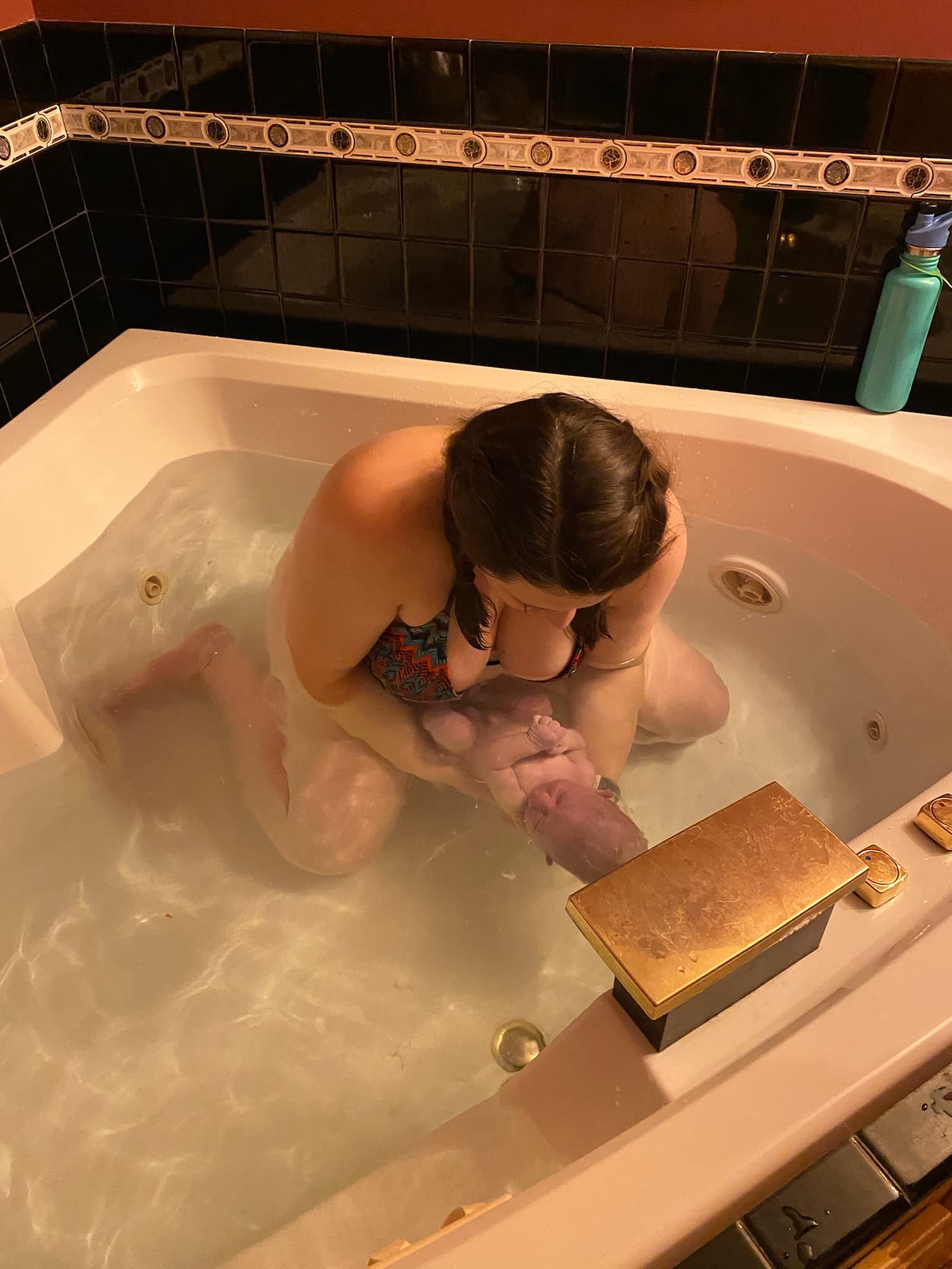 I usually throw up at some point, so we had a bowl on the edge of the tub. Emme moved it and I projectile vomited into the tub! She brought the bowl back quickly and I threw up a few more times into the bowl. You have to have a sense of humor about these kinds of things, so we all laughed at the timing. I drained some of the water and put some fresh water in, but it was still pretty gross. Emme said it was ok if baby was born in it since I felt pushy, and we didn’t know how long we had if we could drain the tub or not and get it filled again. Some more time passed, and I used the jets on my back. My other midwife Grace asked me if I thought there was enough time to drain the tub, clean it and refill? I said I thought so and plus it was pretty gross. I had been thinking that I probably should simply stand up and that would make things kick into gear to meet our baby, but I also didn’t really want to stand up and let the weight of gravity set in. But the idea of getting washed up and in a fresh tub sounded good so I decided to do that. The moment I stood up the pressure changed, and I started vocalizing. I hopped in the shower to rinse off while they drained the tub, cleaned it and began filling it again.