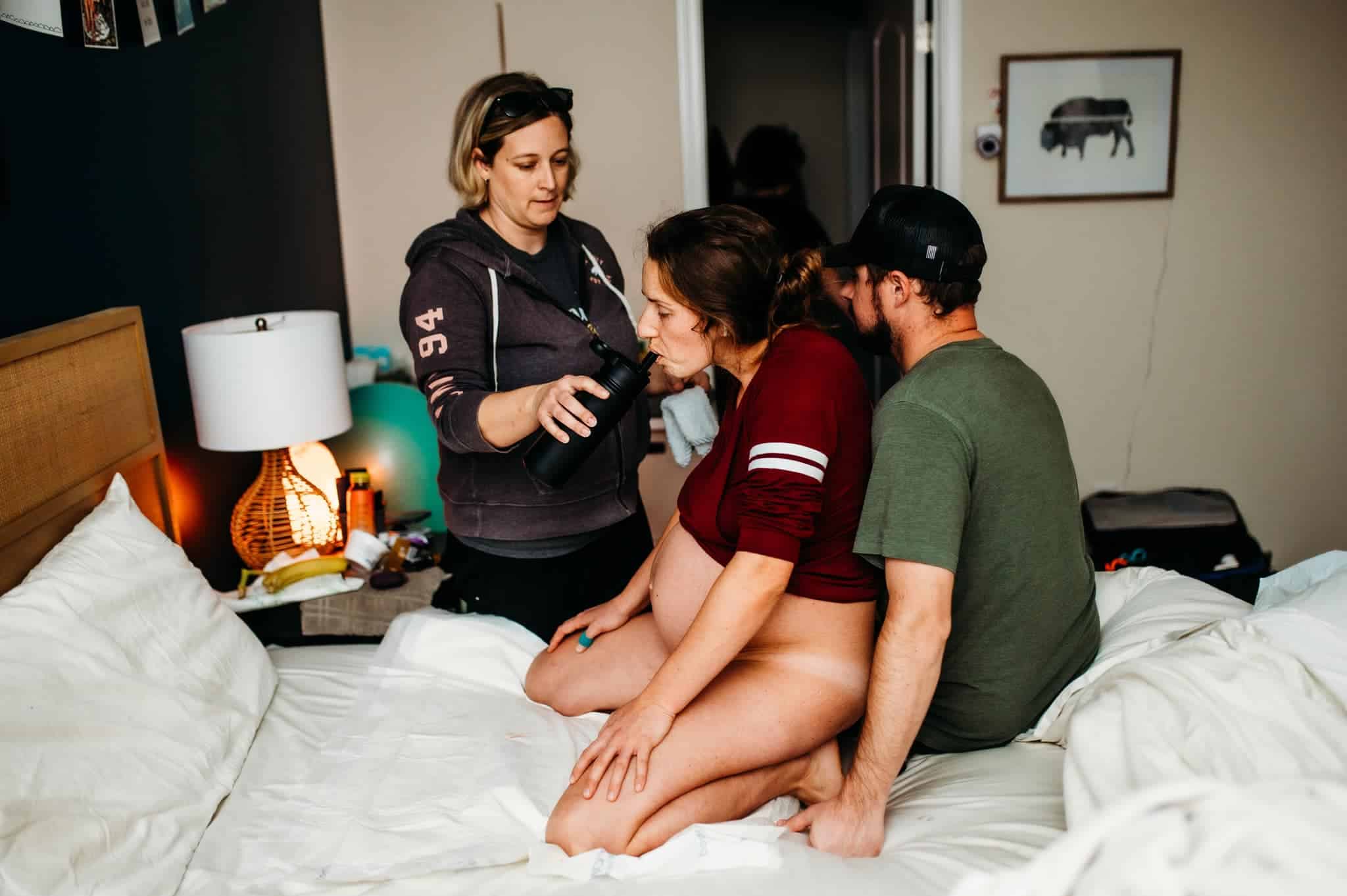 I was on the birth ball at this point and my waves were still very strong. I believe I was in Transformation (Hypnobabies term for transition) at this point; I could feel you begin to get lower now and when I breathed through my waves, I began to feel a bit pushy. I was relieved to hear that the midwife would be here in 15 minutes. At this point, I started to believe today may actually be my birthing day. The midwife arrived around 2pm. About the time the midwife got there was about the time I got on the bed and took off my clothes. I told the midwife I believed you were posterior, but she didn’t think so. This is when I started to push.