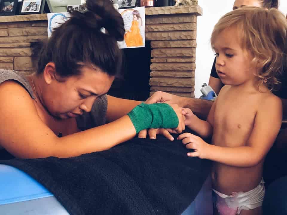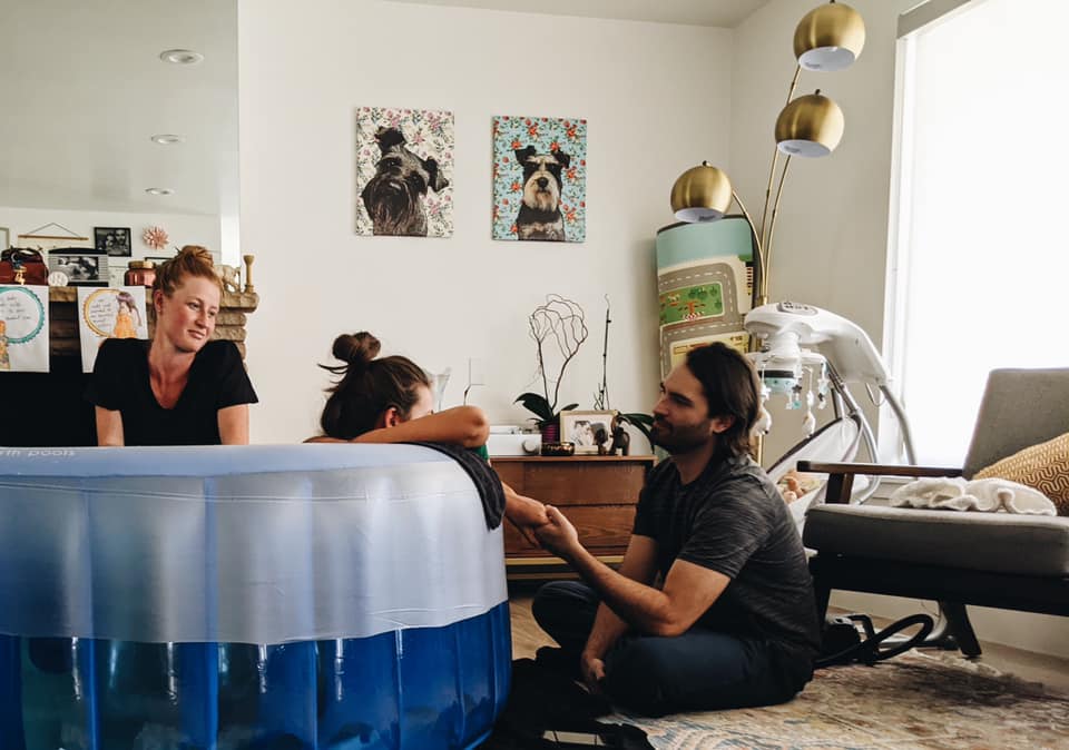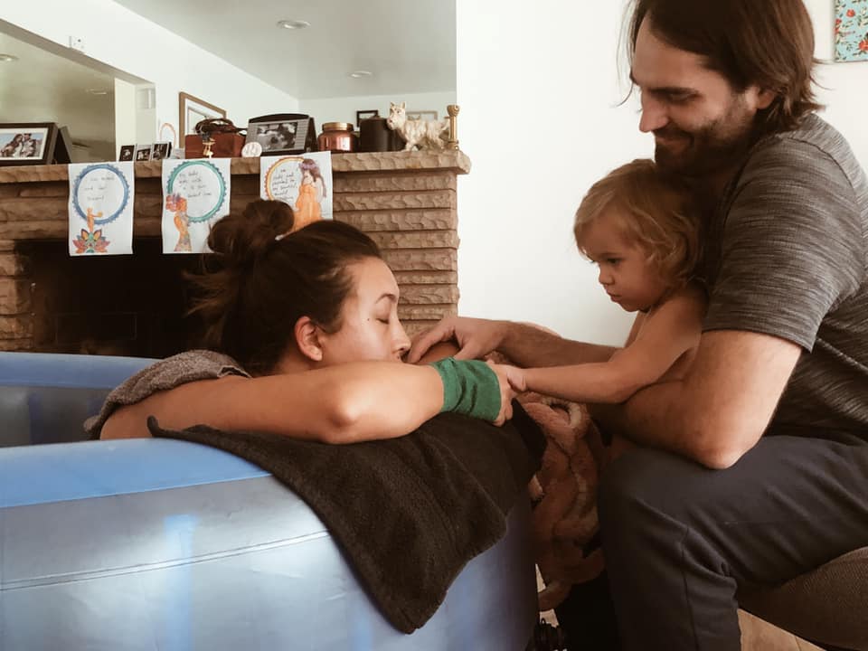 Penny wakes up at about 7:15am and Kyle goes to get her and gives her a little pep talk that “the doctors are here to help mommy and the baby”. She comes into our bed (like every morning) and is so eager to hold my hand as the midwives take my vitals and check baby’s heart rate. Everything is looking great. We get up to have coffee—my waves are still 7 minutes apart. Penny is eager to get into the birthing pool which I’m not surprised because what 2-year-old wouldn’t want to?! We had watched some Hypnobabies homebirth videos with her so that she would have some exposure before the big day. The midwives say that she’s fine to get in the pool, so she splashes around in there for a little bit. My waves are still sitting at about 7 minutes apart, so my birthing team decides to leave us to give us some privacy and allow things to progress without the added pressure of an audience. They leave at about 8:30 am but warn us to call once things start to pick up.