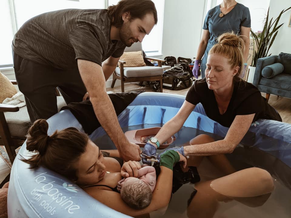About 10 minutes later my placenta is born. It’s not a big deal—one tiny push and its out. My doula places it in a little tub while I lay in the water awhile longer with baby. Baby’s vitals were all checked while she laid on my chest. We are just enjoying this moment. I’ve still got Penny right there looking at her sister and Kyle holding baby’s tiny little hand. Once the umbilical cord stops pulsing, Kyle cuts it, and we get out of the tub. Kyle takes baby girl for skin to skin while I’m helped out of the tub. I’m so thankful for these incredible women I have here helping and supporting me during such a special time in my life. They wrap me up in towels and help me down the hall to take a quick rinse in the shower.