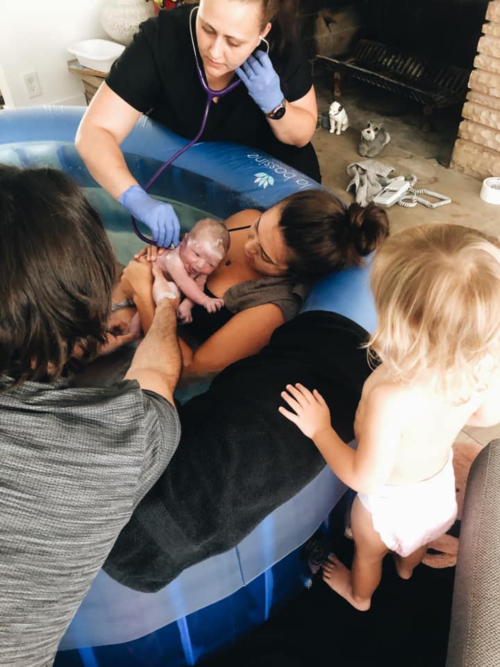 Baby girl was born in her bag of waters! Although my water had broken, she apparently hadn’t broken through the bag, so my doula/midwife quickly opens the sac up with her hands while she’s still under the water. She assists Kyle with catching her and I pull her up onto my chest. Baby girl makes one quick and loud cry and begins to look around. Penny is standing up at my head leaning over my shoulder to see her little sister. She’s saying “baby!!” over and over. Our family is whole in this moment. I’ve got both my girls right here. I have my entire world right here in the warm embrace of our own home. An incredible and beautiful moment I’ll never forget.