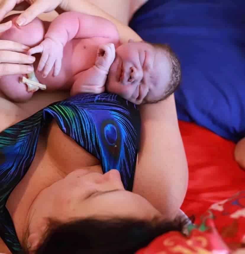 I felt FER (Fetal Ejection Reflex), I told my midwife my body is taking over, she said “okay go with it” and then my sisters started exclaiming that they saw the head! I felt at peace and thankfulness for every wave. I wasn’t listening to any tracks at this point, but I was using my cues. His shoulders got a little stuck and I had to switch positions three times between his head and his body but it all times I felt completely calm. When he was born, he needed a few breaths with the Ambu bag but no resuscitation his heart was fine he just didn’t cry or breathe at first, he was stunned. My sisters were all panicked, and everyone remarked how calm I was. I felt calm genuinely, I knew he was okay. I talked to him and let my midwife give him what he needed. It was just seconds, but it felt like a long time of course. when I watched the video, I was surprised at how much I had absolutely no clue about.