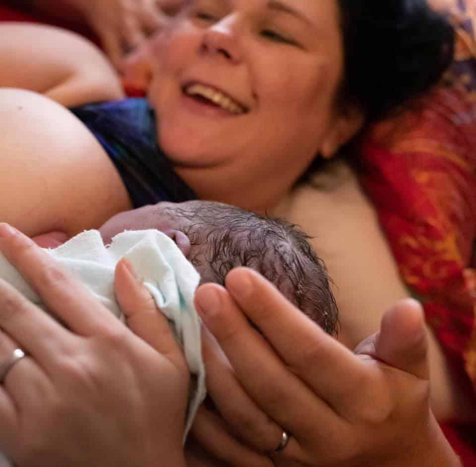 I moved from the toilet to hands and knees on my bed, my midwife arrived. I was feeling so much pressure I asked her to check me. She said I was 7 cm. When I was only 2 cm with my first son I was vomiting and in absolute agony, so I was really glad to be 7 cm. But within maybe 10 minutes of her exam I felt a strong urge to push. In my first birthing time I pushed for nearly 4 hours. I kept thinking I wasn’t pushing effectively, and I constantly evaluated myself, whether or not my cervix had a lip etc. I just could not get out of my head. I was thinking that the Pushing Baby Out track (Hypnobabies track just for pushing) would help me not do that this time but I never got to play it!