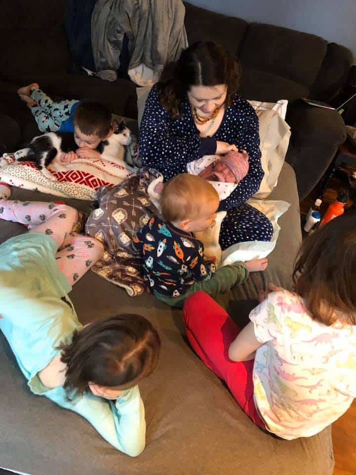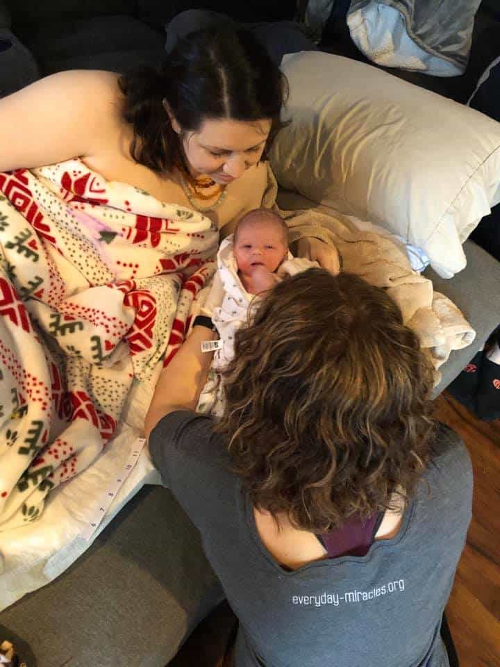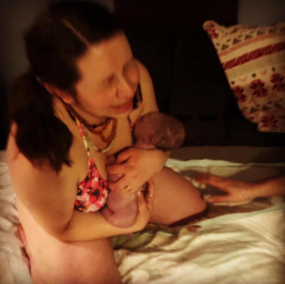 It’s actually funny because I had been having a feeling when practicing my visualizations that I wouldn’t make it into the big tub this time. My doula walked in at 6:45 and I told her I felt pushy. She came to help me, and we went into the family room. My husband had actually put the pads upside down 😂 so I asked her to flip them over. She ran to do something in the other room, and I took my pants off and climbed up on the bed since I could feel her coming. 6:58 my water broke, and my body gave a good push. 7:01 her head was born into mine and my husband’s hands (I’ve caught four of our babies so not my first rodeo 😉). Our midwife ran in at 7:03 as I could feel baby’s shoulders rotating. One more wave and her body was out at 7:05 into my hands.