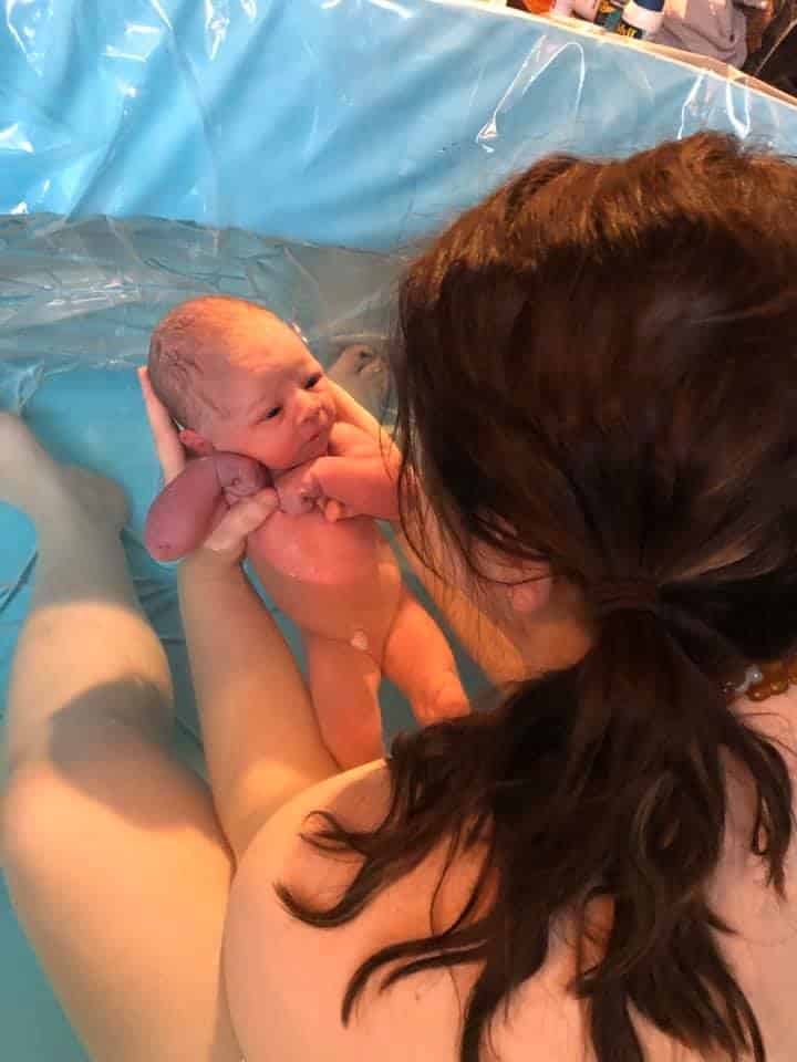 “It’s actually funny because I had been having a feeling when practicing my visualizations that I wouldn’t make it into the big tub this time. My doula walked in at 6:45 and I told her I felt pushy.”